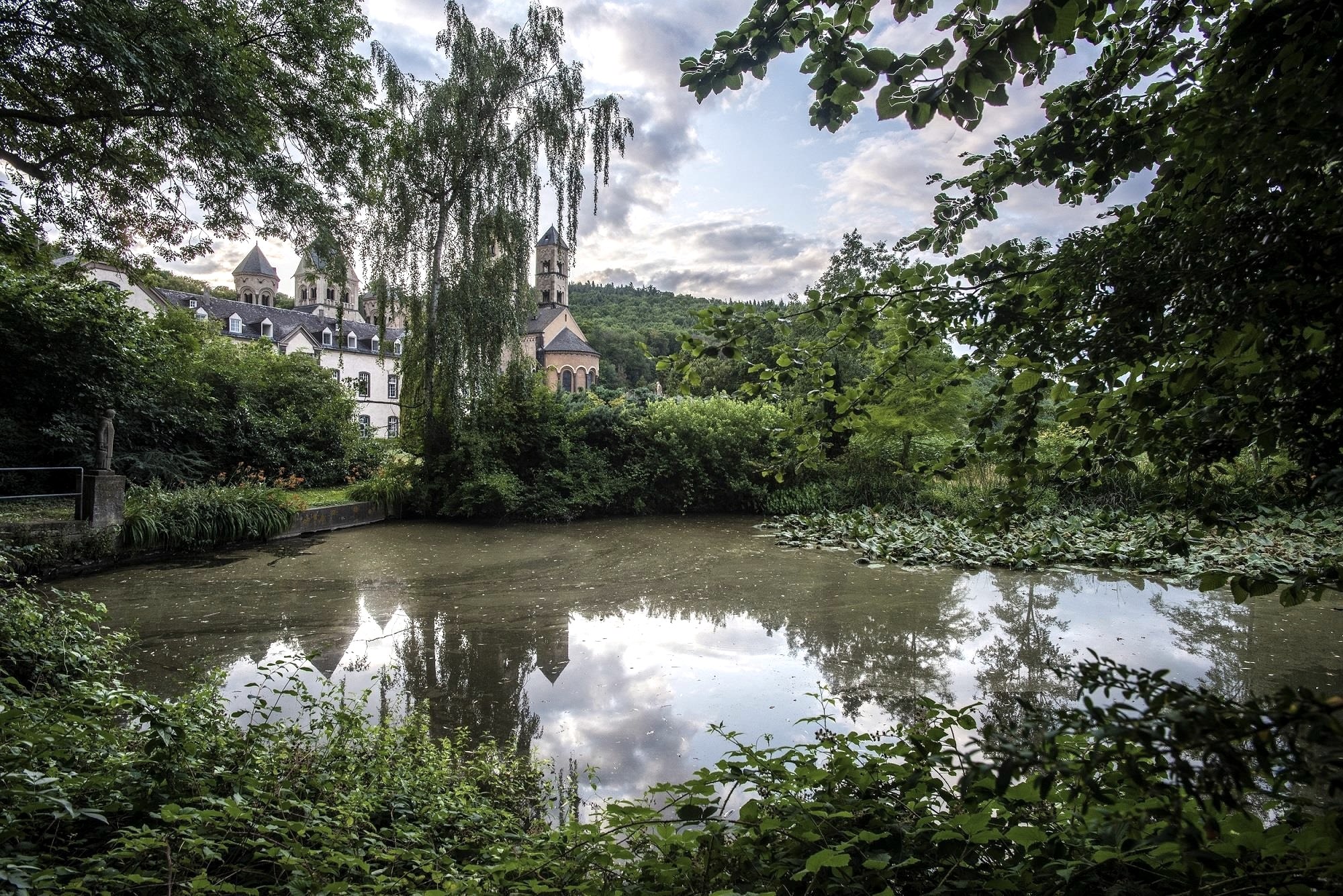 Pfalzgraf Heinrich II. von Laach gründete 1093 das Kloster am See gegenüber seiner Pfalzgrafenburg. 1156 weihte Erzbischof Hillin von Trier die Kirche ein und gegen 1230 wurde der letzte Teil der Kirche, die Vorhalle, das so genannte Paradies, vollendet. Die Abteikirche gehört zu den wertvollsten romanischen Kirchen im Rheinland. Bei der Aufhebung 1802 in Folge der französischen Revolution wurde die gesamte Kircheneinrichtung entfernt. Nach einer privaten Nutzung errichteten von 1862-1872 die Jesuiten hier ihre Hochschule, bis 1892 erneut Benediktinermönche das Kloster besiedelten. Seitdem ist das Kloster, das auch viele Besucher und Gäste aufsuchen, der Ort der Mönche für ihren Gottesdienst und für ihre vielfältigen Arbeiten, die von vielen Mitarbeitern aus der Region mitgetragen werden.