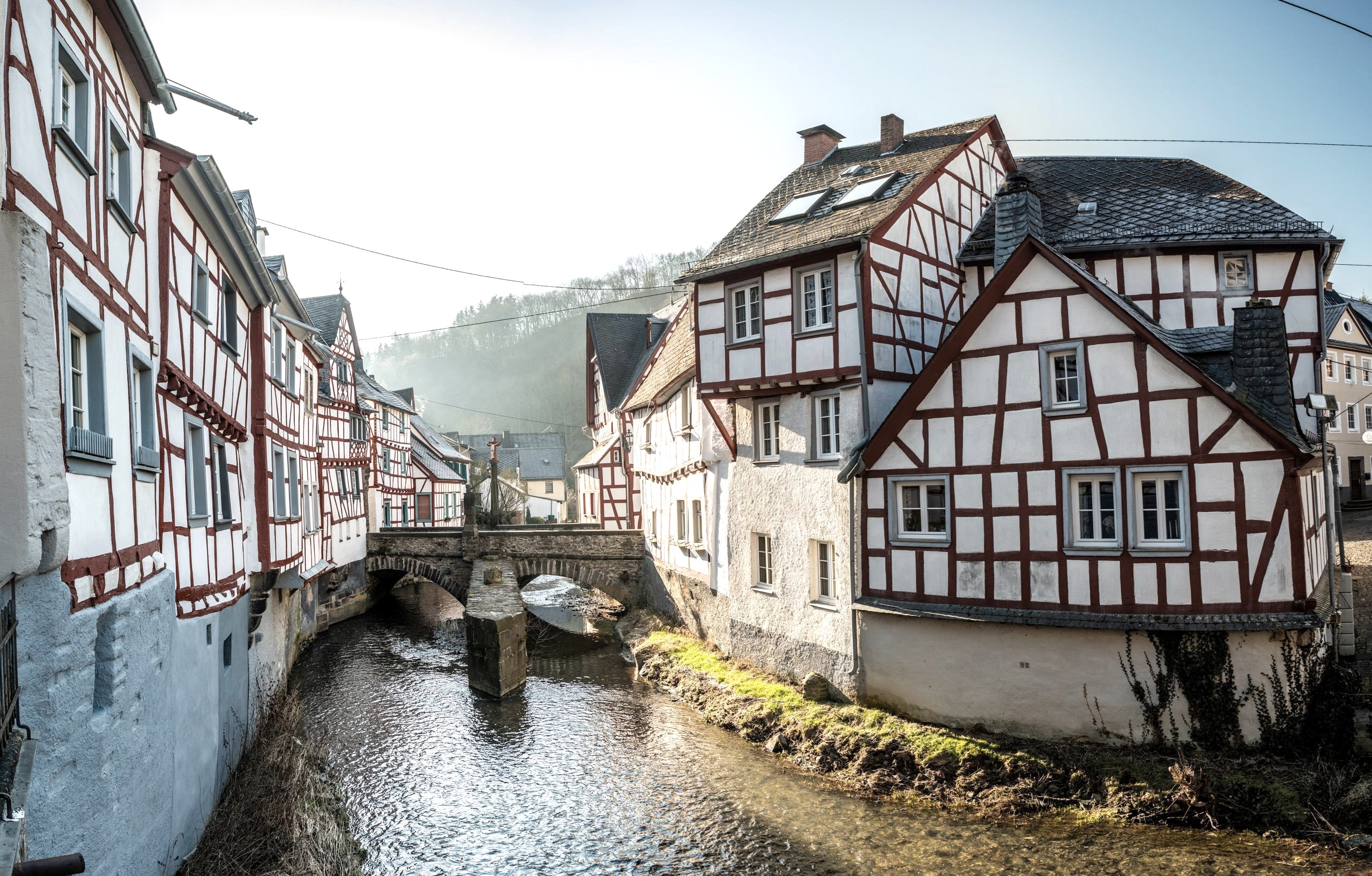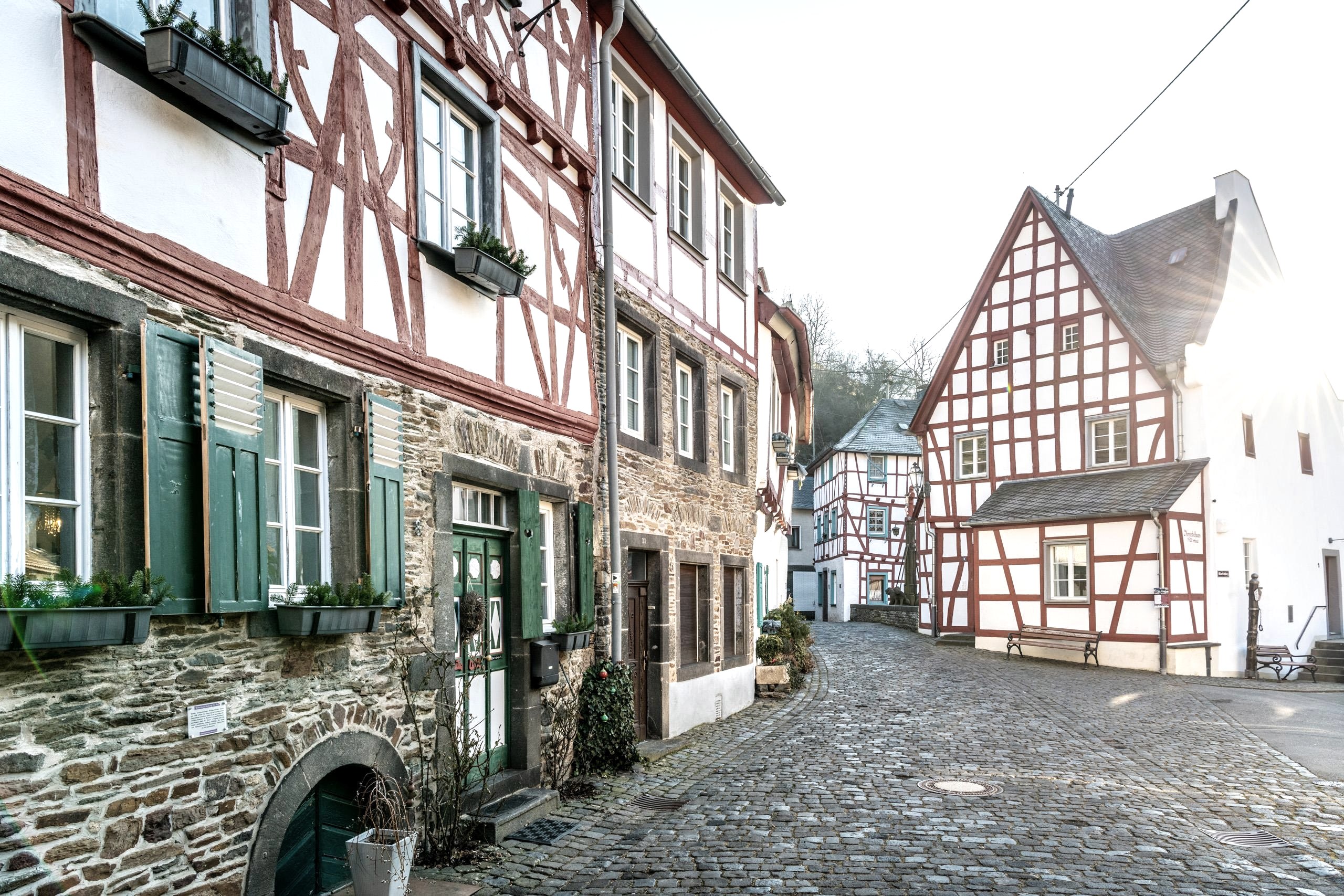 Eng schmiegen sich die rot-weißen Fachwerkhäuser aneinander, besonders das Viergiebelhaus aus dem 15. Jahrhundert versetzt die Spaziergänger in eine märchenhafte Vergangenheit. Die noch wunderschön erhaltenen Fachwerkhäuser zeugen von dem Wohlstand, den Monreal durch die Verarbeitung von Schafwolle und die Tuchherstellung ab dem 17. Jahrhundert erlangte. In der zweiten Hälfte des 19. Jahrhunderts war die Handarbeit nicht mehr konkurrenzfähig gegenüber internationalen, industrialisierten Wettbewerbern, die Bevölkerung verarmte. Ein Schicksal, das Monreal mit dem ebenso pittoresken Monschau teilt.