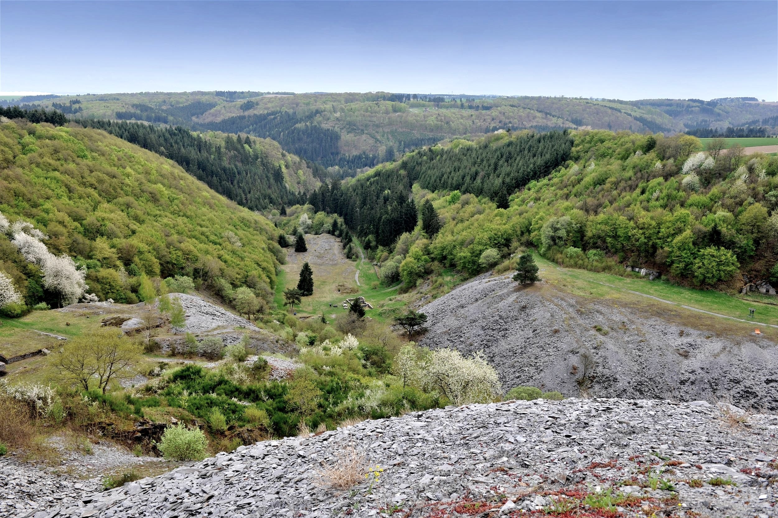 The link between these landscapes is the local slate mining and processing and the silky shining slate roofs to the left and right of the trail. This part of the Eifel region is a hub for Europe's slate industry. Slate has been mined here since Roman times and the term "Moselschiefer®" (Mosel slate) is one of the first brand names ever, with a documentary mention in 1588.