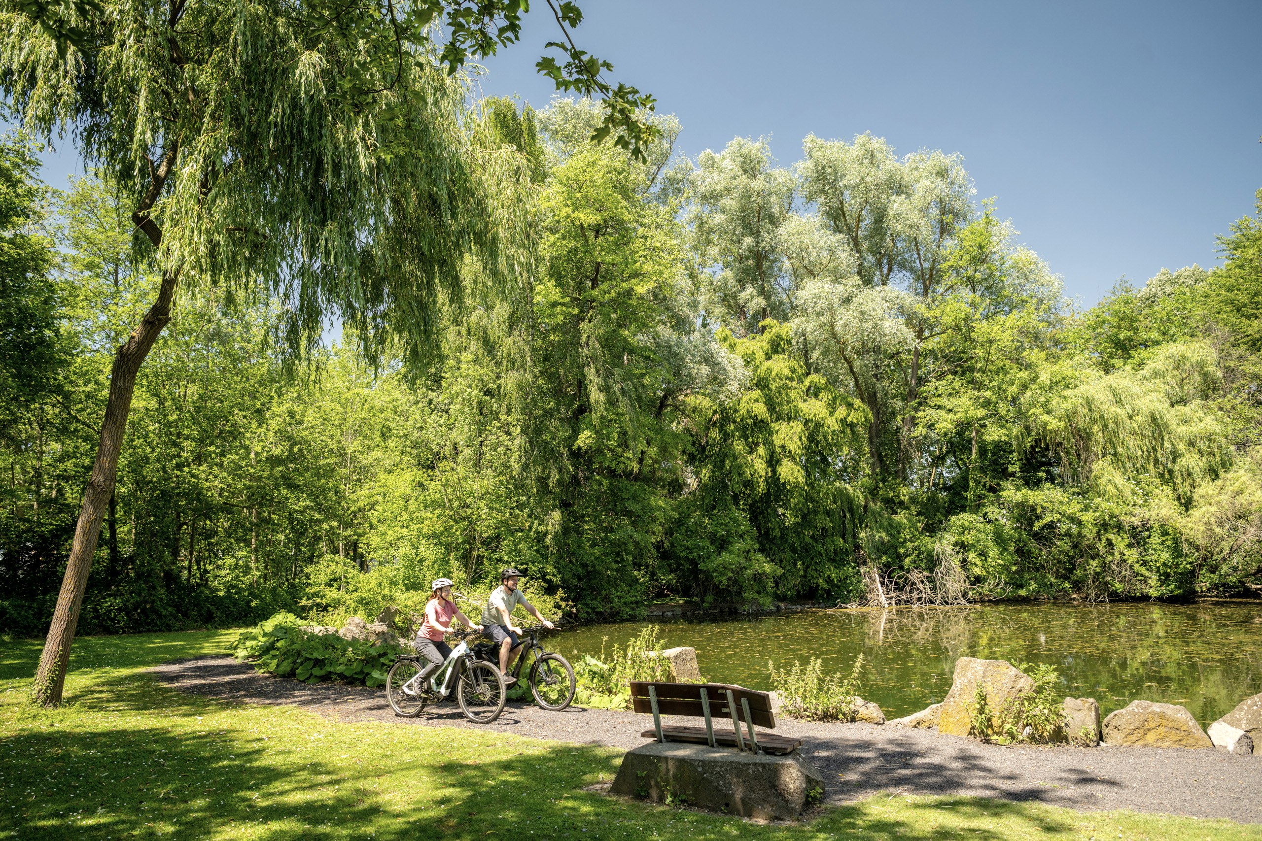 Tip: Four excursions lead away from the main path of the Volcano Park cycle route and form a connection to the Volcano Park information centre at Rauschermühle in Plaidt/Saffig (excursion - 0.6 km), the Meurin Roman mine in Kretz (excursion - 2.6 km), the “Deutsches Vulkanmuseum”, the German Volcano Museum, with the world-famous rock-cut cellars, in Mendig (excursion - 3.2 km) and the “Mayener Grubenfeld” disused basalt stone mine (excursion - 0.8 km). After around three hours, the final destination, the 2,000-year-old town of Andernach on the Rhine, known for its baker's boy legend, is reached.