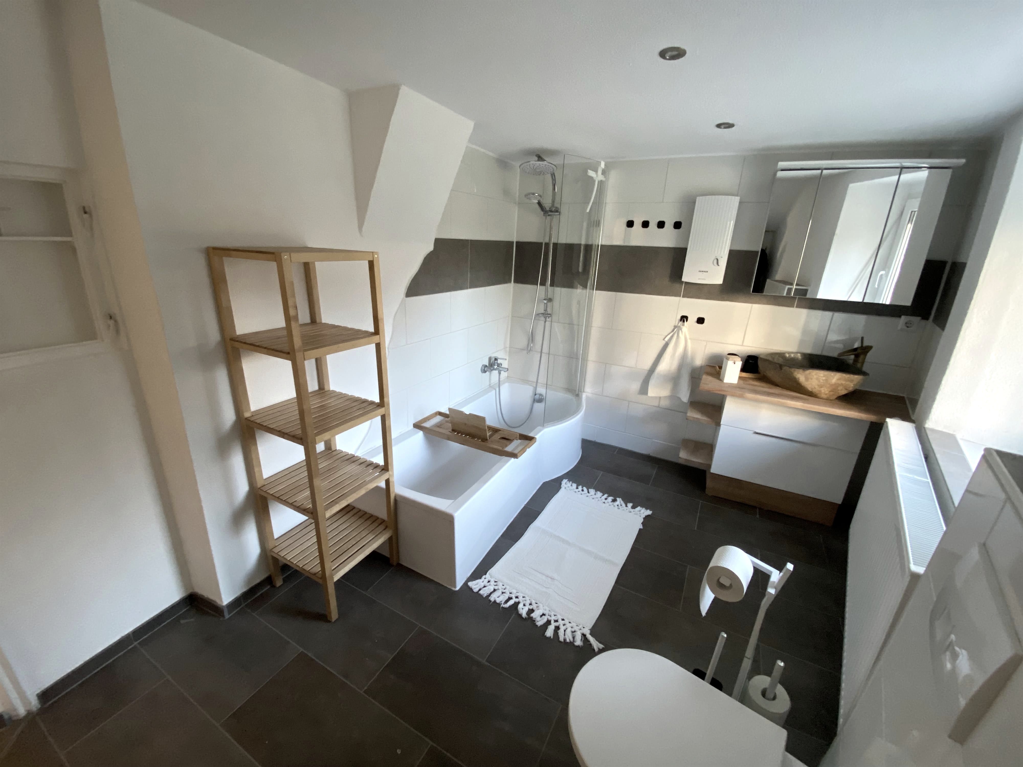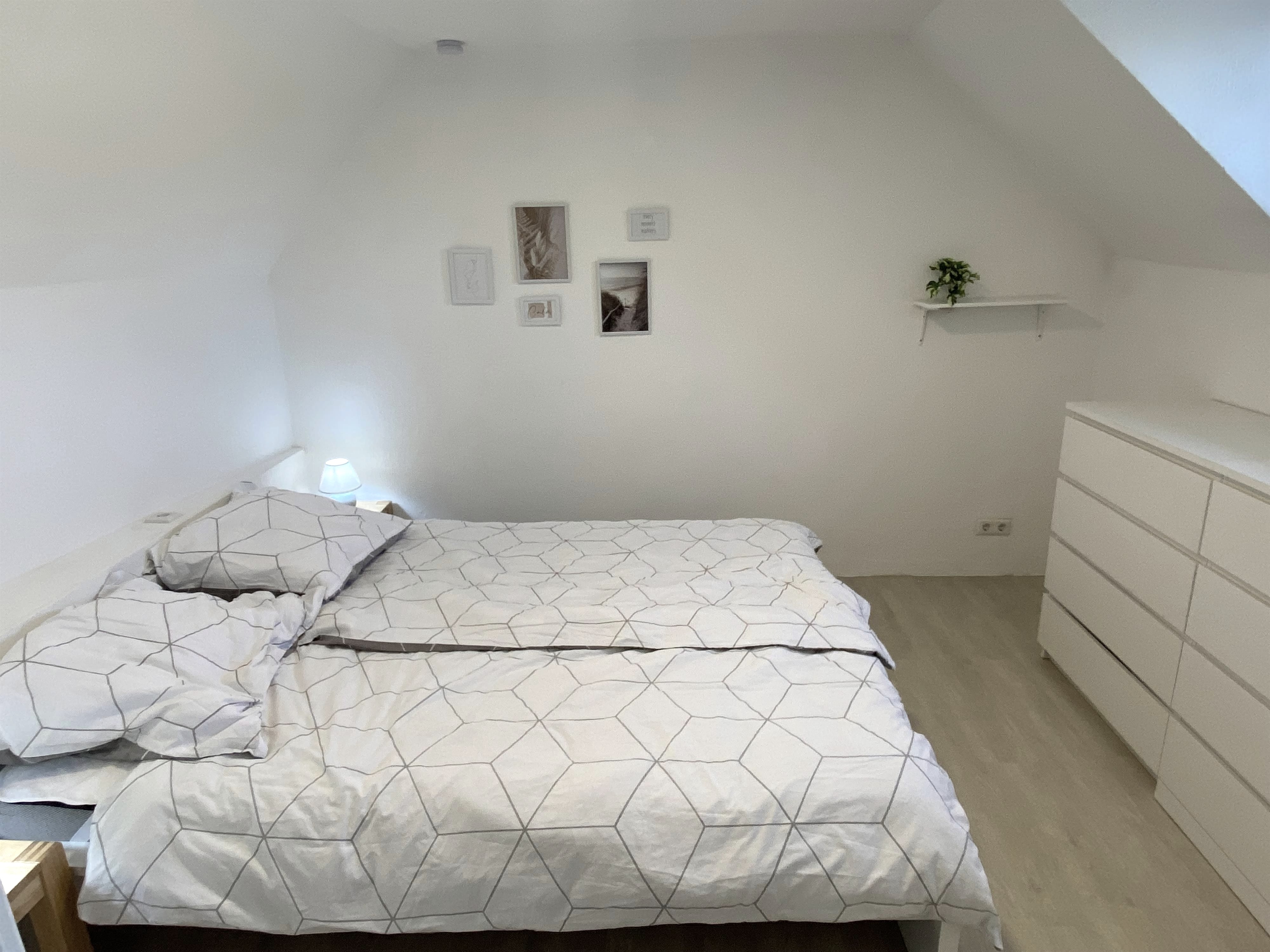 Maison de vacances pour 4 personnes. Une chambre double avec un lit double (1,60 x 2,00 m), une chambre double avec 2 lits simples (0,80 x 2,00 m). Cuisine bien équipée (machine à café, bouilloire électrique, grille-pain, mixeur, réfrigérateur avec compartiment congélateur). Salle de bain avec baignoire-douche, machine à laver et sèche-linge disponibles. TV à écran plat, WLAN, draps et serviettes inclus.