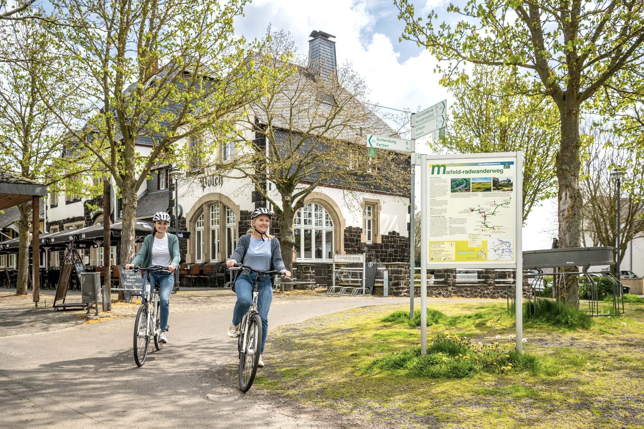 Il est loin le temps où les locomotives à vapeur ronflaient sur ce trajet dans l'Eifel . Aujourd'hui, la voie ferrée désaffectée est un paradis pour les cyclistes. La piste cyclable du Maifeld, entre le Rhin et la Moselle, est presque au niveau du sol, ce qui permet aux enfants de faire rouler leurs vélos. Le regard embrasse les vastes étendues du Maifeld (pendant la floraison du colza fin avril/début mai, on pédale à travers une mer de fleurs dorées) et les volcans qui se sont formés à une époque où l'Eifel était encore en ébullition. Les enfants exigent plus d'aventure que de belles vues : au-dessus de la vallée de la Nette, on passe sur un viaduc en pierre naturelle d 'environ 40 mètres de haut , puis il faut déjà allumer les lumières, car le tour passe maintenant par deux tunnels.