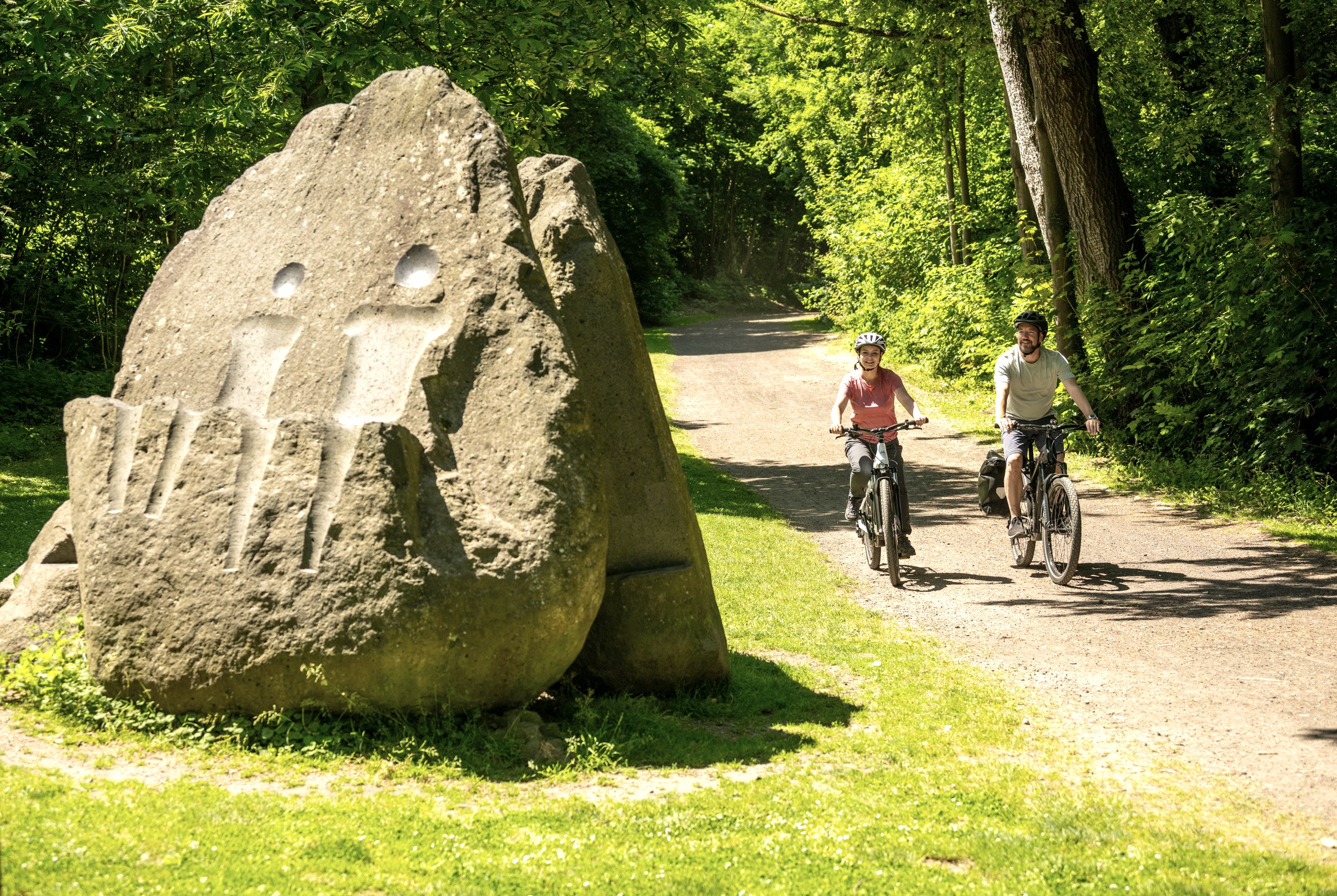 Elle est très adaptée aux familles et passionnante pour tous les âges : La piste cyclable du parc volcanique. Avec ses 33,3 kilomètres de long et seulement une légère pente, la piste cyclable relie Mayen, le centre de l'Eifel volcanique de l'Est, à Andernach en passant par Mendig et ses impressionnantes caves rocheuses, à de nombreux projets volcanologiques et archéologiques du parc volcanique Mayen-Koblenz. Le "Vulkanius" - la mascotte rouge feu du parc volcanique - indique le chemin.