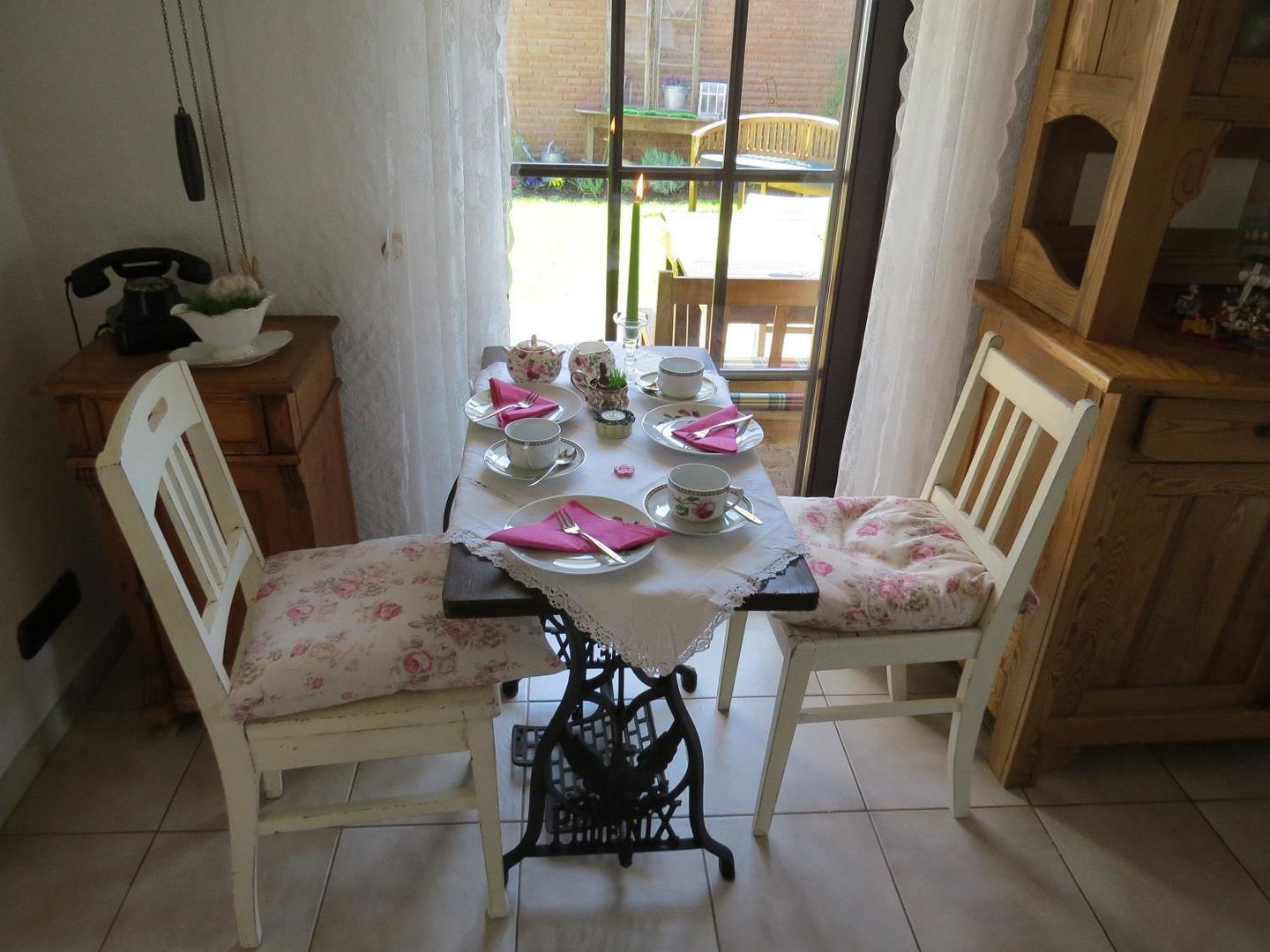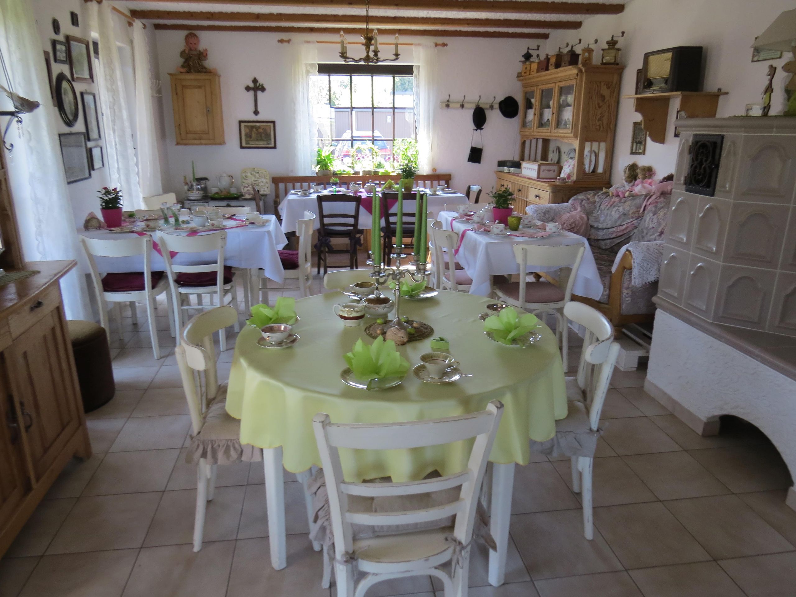 In den liebevoll eingerichteten Räumlichkeiten spielt die Rose eine große Rolle. Auf dem Porzellan, den Tischdecken und dem Mobiliar spiegelt sich die Blume wieder.