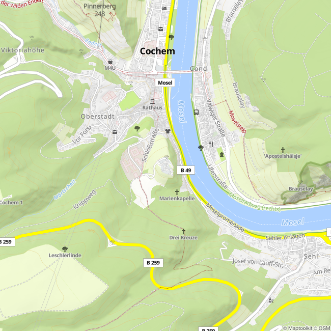 Hoch über Cochem erhebt sich die größte Höhenburg an der Mosel. Auf mächtigem Fels gelegen ist die Reichsburg mit ihren Erkern und Zinnen ein reizvoller Anblick. Die mittelalterliche Burg, die im Eigentum der Kurfürsten von Trier während des pfälzischen Erbfolgekrieges beschädigt wurde, hat der Berliner Kommerzienrat, Louis Ravené, im Zuge der Burgenromantik im 19. Jahrhundert liebevoll restauriert und im neugotischen Stil wiederaufgebaut. Hier erlebt der Besucher eine eindrucksvolle Gestaltung der Innenräume, wie Rittersaal, Speisesaal, Jagdzimmer, Kemenate usw.