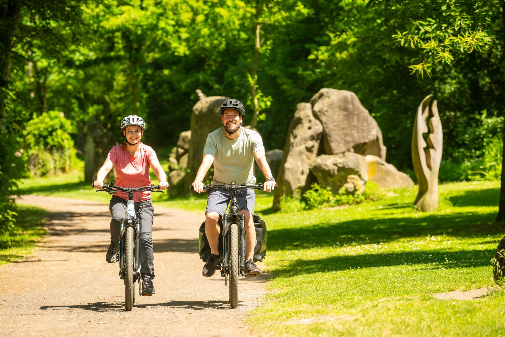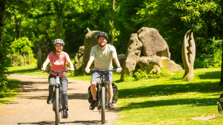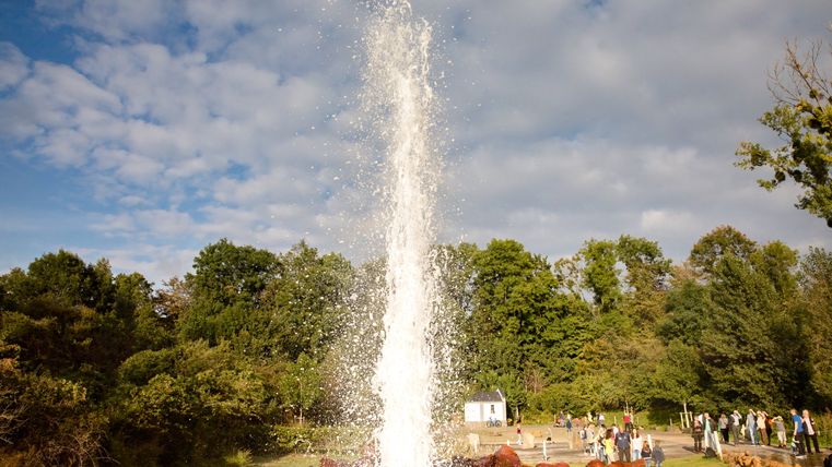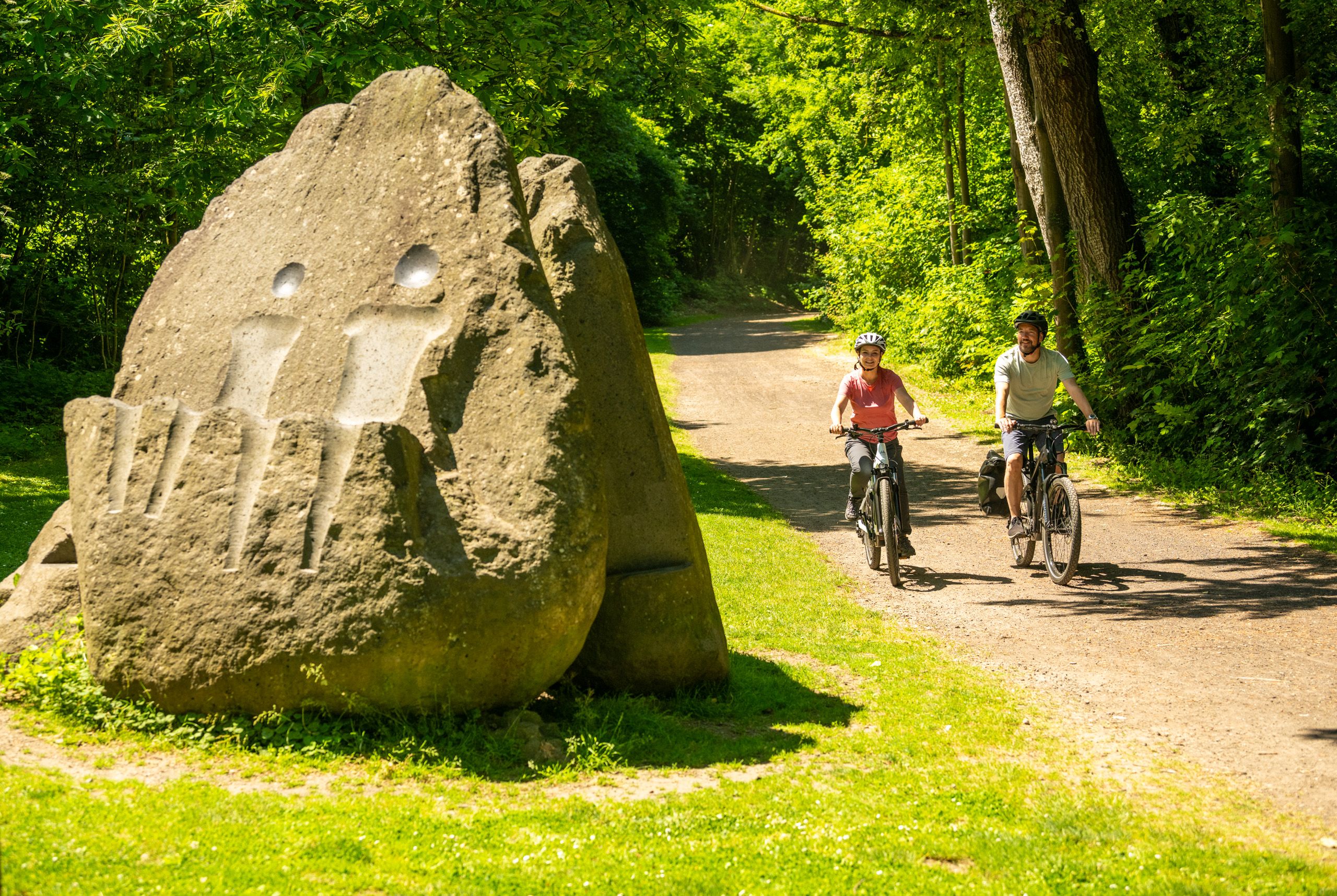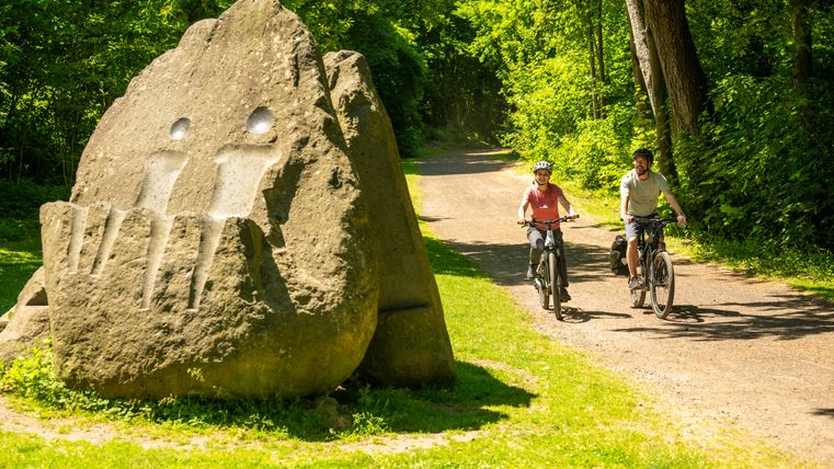 ‘Vulkanius’ geeft de richting aan tijdens het Vulkaanpark-fietspad, van de toppen van de Eifel omlaag tot in het dal van de Rijn. Dit is ook de variant die voor een fietstocht met kinderen is aan te raden, aangezien het traject lichtjes bergaf loopt en slechts kleinere stijgingen kent. Het Vulkaanpark-fietspad verbindt op zijn 32 kilometer verschillende projecten van het vulkaanpark, die zich hebben toegelegd op vulkanisme en geologie van de oostelijke Eifel. Zo verschaft het Mayener Grubenfeld inzicht in de geschiedenis van de basaltlava-exploitatie, het educatieve centrum Terra Vulcania in de exploitatie en verwerking van gesteente. Met ‘Vulkanius’ gaan we naar het Duitse Vulkaanmuseum in Mendig, de Romeinse tufsteenmijn Meurin, naar het informatiecentrum Rauschermühle en naar de ‘Alter Krahnen’ in Andernach. Wie nog een beetje tijd heeft, kan in het beschermde natuurgebied ‘Namedyer Werth’ ´s werelds hoogste koudwatergeiser bewonderen.