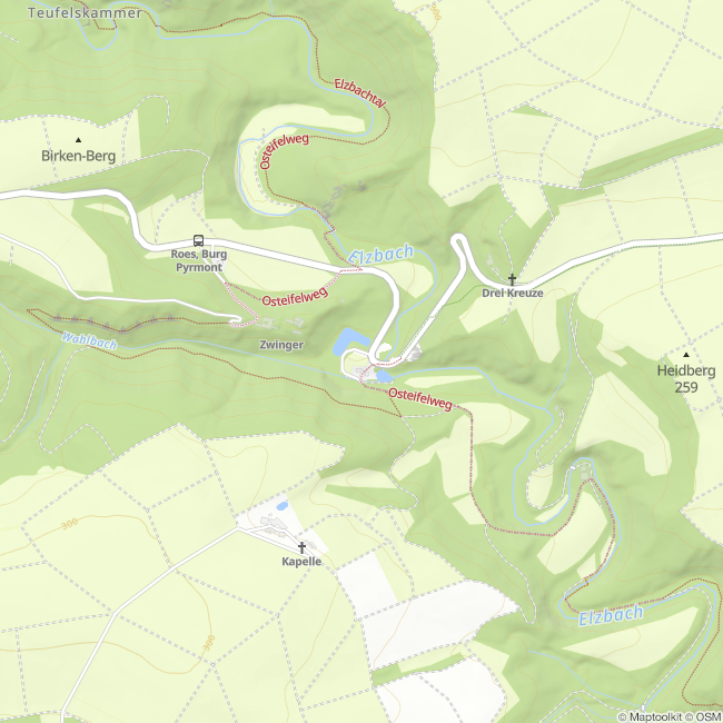 Entdecke die Schönheit und Ursprünglichkeit der Natur entlang des Elzbaches: wandere auf den Traumpfaden „Eltzer Burgpanorama“ oder „Pyrmonter Felsensteig“. Ein besonders schöner Abschnitt ist der Jakobsweg des Eifelvereins: von Monreal in der Vordereifel durch das Elzbachtal nach Moselkern an der Mosel.