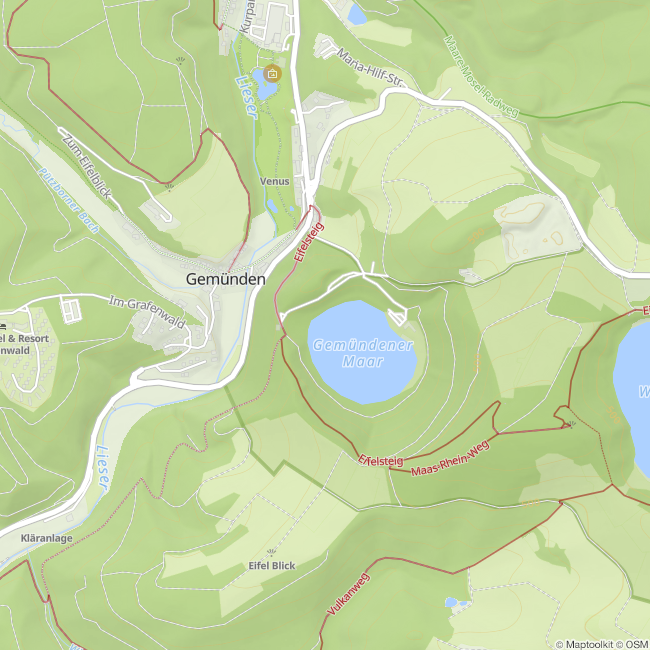 Mit etwa 7 Hektar Wasserfläche ist das Gemündener Maar das kleinste der drei berühmten Eifel-Augen - die Dauner Maare, entstanden durch vulkanische Aktivität. Außerdem ist es mit 406 Meter über NN am tiefsten in die vulkanische Landschaft rund um Daun eingebettet. Tief lässt das klare Wasser blicken, doch bis zum Grund auf 39 Meter reicht es nicht.