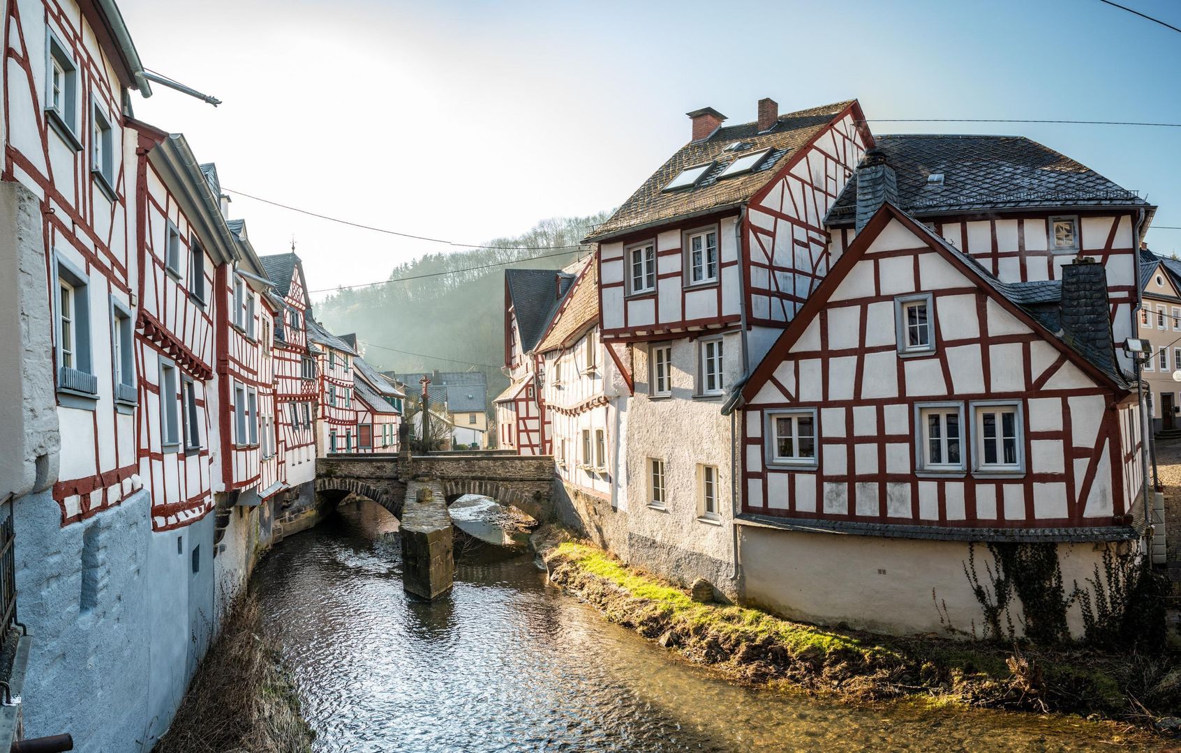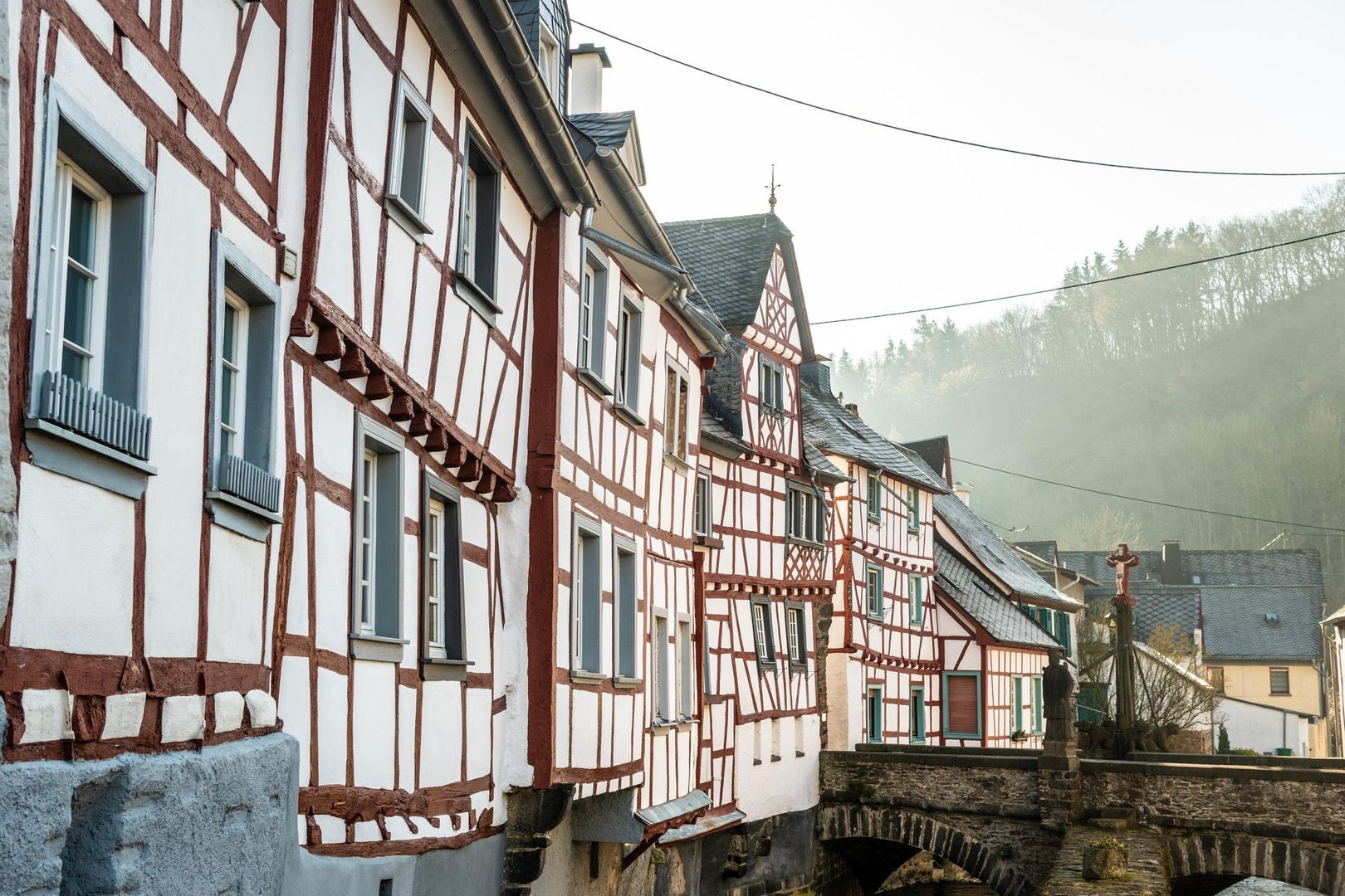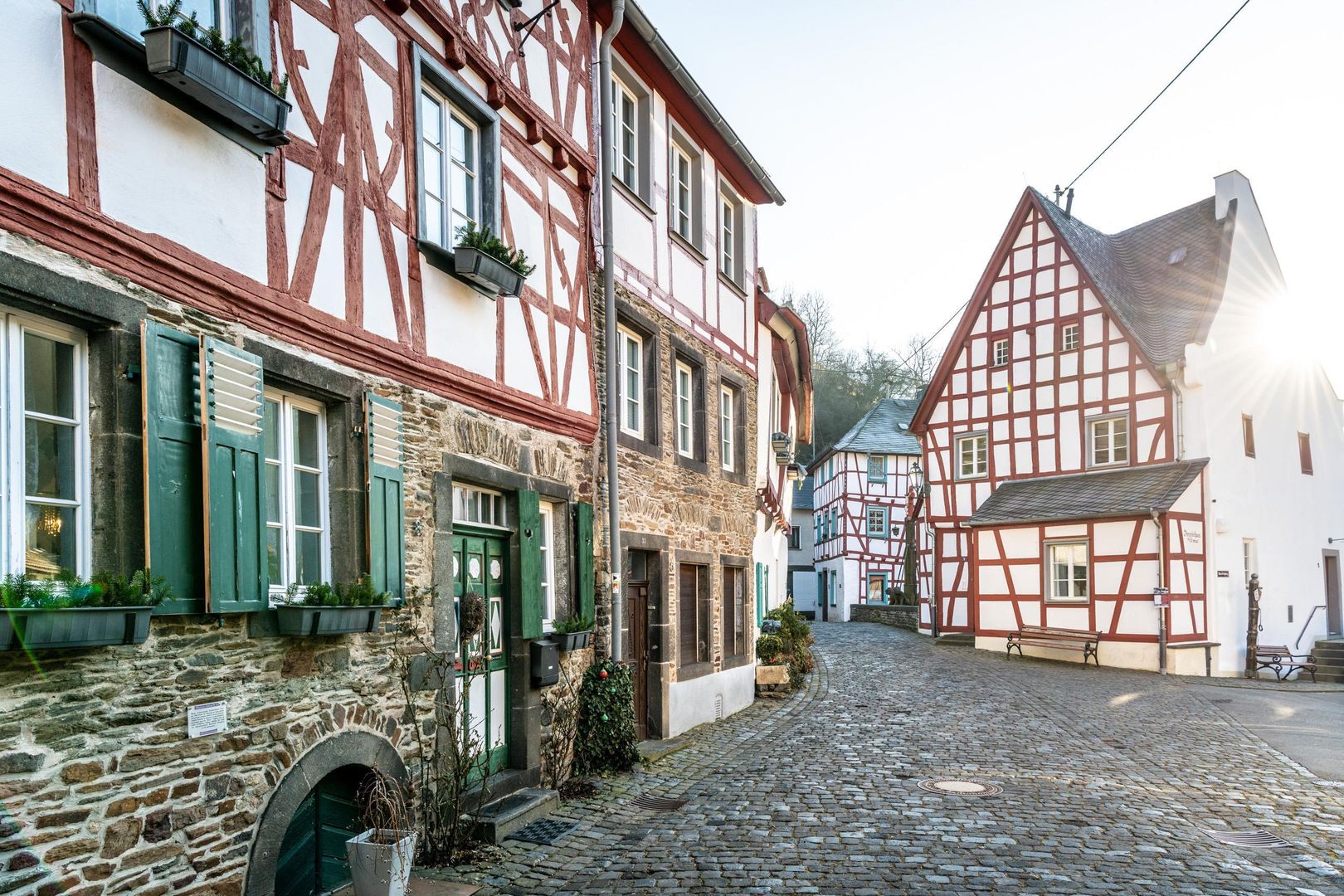 Eng schmiegen sich die rot-weißen Fachwerkhäuser aneinander, besonders das Viergiebelhaus aus dem 15. Jahrhundert versetzt die Spaziergänger in eine märchenhafte Vergangenheit. Die noch wunderschön erhaltenen Fachwerkhäuser zeugen von dem Wohlstand, den Monreal durch die Verarbeitung von Schafwolle und die Tuchherstellung ab dem 17. Jahrhundert erlangte. In der zweiten Hälfte des 19. Jahrhunderts war die Handarbeit nicht mehr konkurrenzfähig gegenüber internationalen, industrialisierten Wettbewerbern, die Bevölkerung verarmte. Ein Schicksal, das Monreal mit dem ebenso pittoresken Monschau teilt.