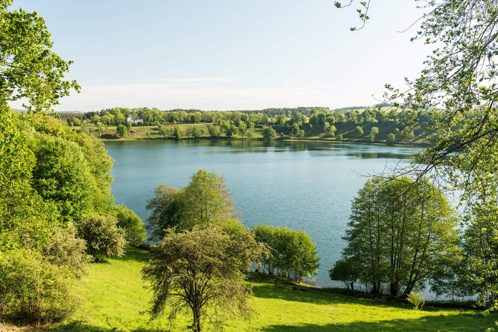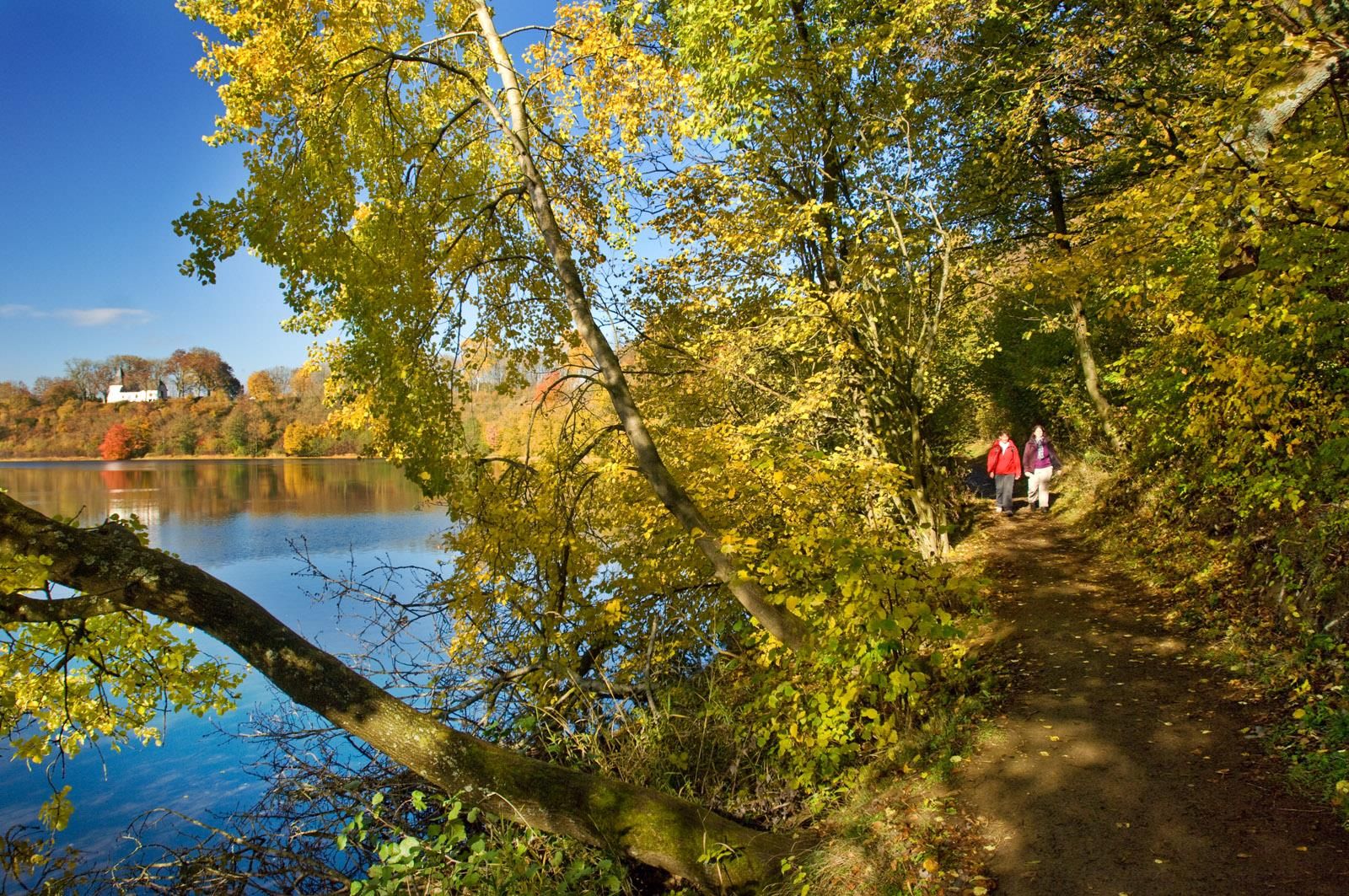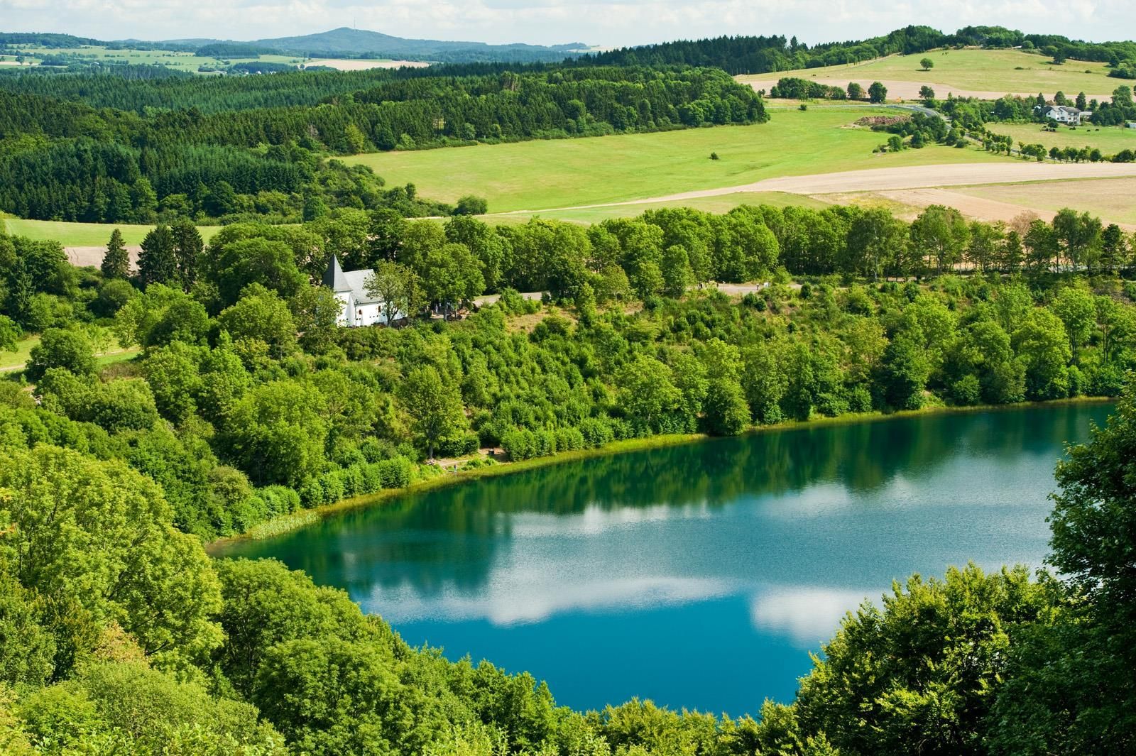 Auch der deutsche Landschaftsmaler Fritz von Wille war so fasziniert vom Weinfelder Maar, dass er es immer wieder in seinen Bildern verewigte. Zu seinen Lieblingsmotiven gehörte die kleine Kapelle am Nordufer, die dem heiligen Martin geweiht ist. Sie war einst Pfarrkirche des Dorfes Weinfeld, welches im 16. Jahrhundert von der Pest heim gesucht wurde. Wer durch Ziehen der Seile die Glöckchen im Innern zum Läuten bringt, darf sich etwas wünschen. Bis heute wird der dazugehörige Friedhof von der Ortsgemeinde Schalkenmehren gepflegt und genutzt. Hiervon leitet sich auch der zweite Name, Totenmaar, ab.
