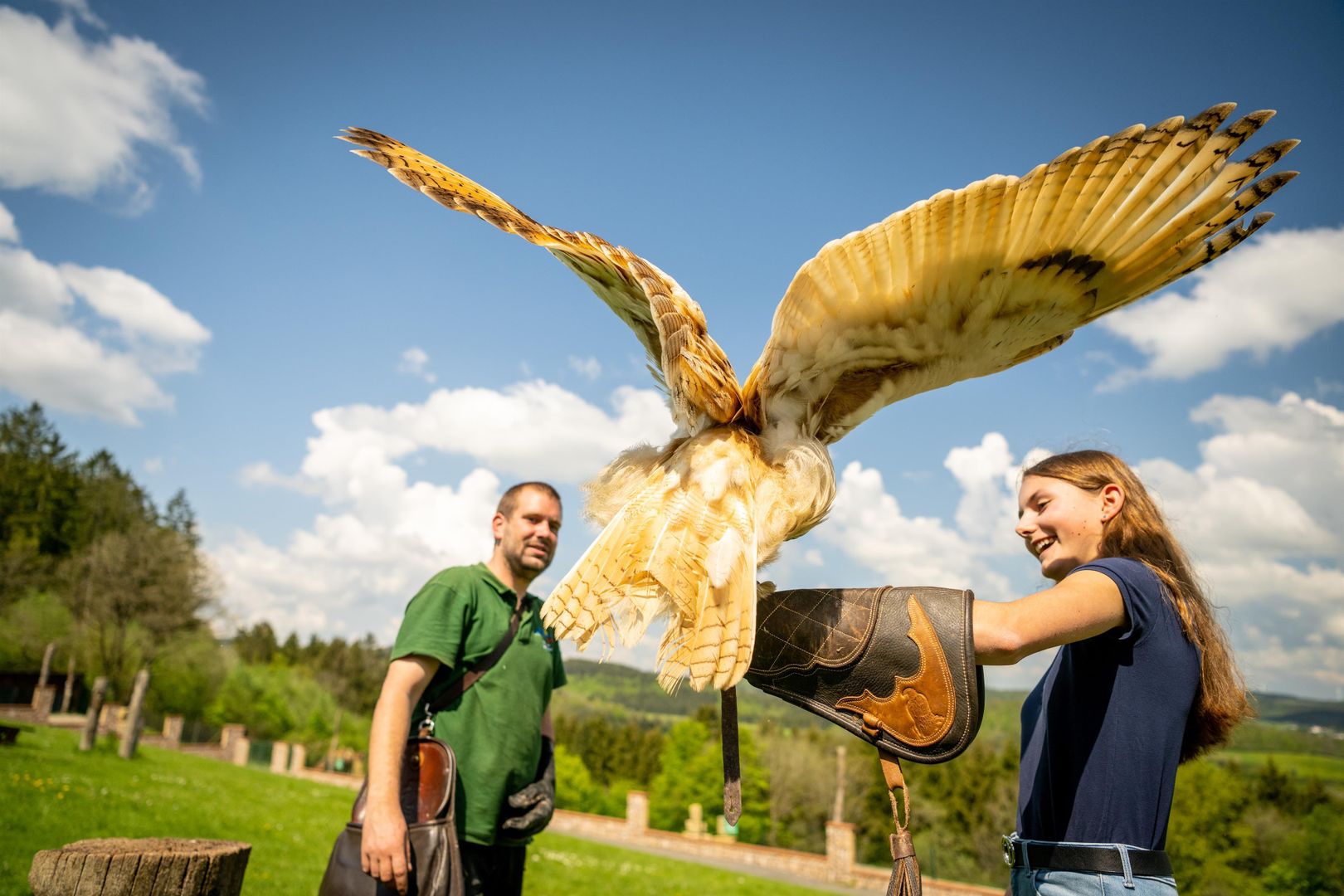 Das weitläufige Greifvogelgehege mit seiner Falknerei präsentiert atemberaubende Flugshows der gefiederten Akrobaten und viele Informationen über die Lebensweise der natürlichen Könige der Lüfte.