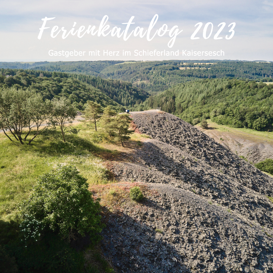 In unserem Ferienkatalog 2023 finden Sie unsere ,,Gastgeber mit Herz“ im Schieferland Kaisersesch. Wir laden ein, sich verwöhnen zu lassen, sich wohlzufühlen und einmal mit Leib und Seele Urlaub zu nehmen. Lassen Sie sich von der Naturlandschaft verzaubern und genießen Sie abseits von Stress und Hektik die Ruhe und die einzigartigen Ausblicke.