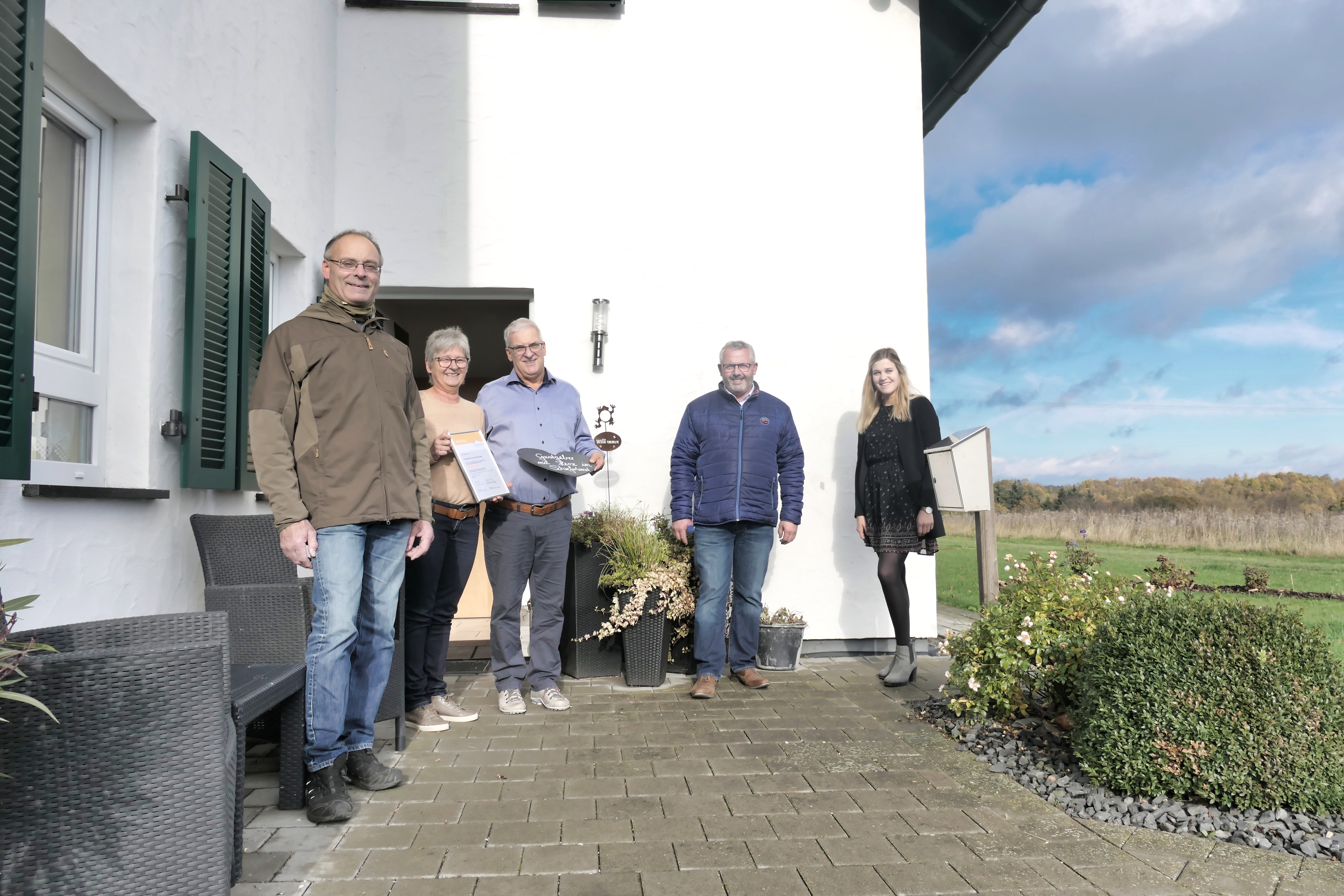 Bürgermeister Albert Jung, Ortsbürgermeister Marcus Cortnum sowie die Touristikerinnen Christina Schmitt und Linda Bamberg gratulieren Margret und Helmut Wolkenfeld zu dieser Auszeichnung.