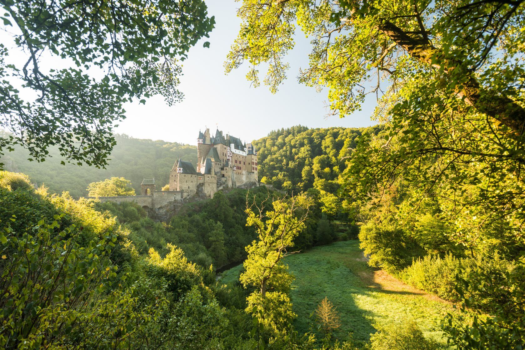 Hand in Hand gehen wir voran, um uns herum leuchtende Rapsfelder. Hier oben ist es immer luftig, daran hat sich nie etwas geändert. Der Horizont ist weit, Hunsrück, Taunus und Westerwald sind in der Ferne sichtbar. Aber dorthin wollen wir gar nicht. Unser Weg über den Traumpfad Eltzer Burgpanorama lässt uns vollkommene Schönheit viel näher erleben. Wo da vorn ein dichtes grünes Band aus Mischwald die tiefe Schlucht im sanft gewellten Maifeld-Plateau verrät, da ist der Höhepunkt unserer Wanderung: die Burg Eltz! „Vollkommene Schönheit? Meinst du nicht, das ist etwas zu viel verlangt?“, fragt mich meine Ehefrau. „Du wirst schon sehen …“, antworte ich und verrate mehr nicht. Ich habe ihr noch nicht gesagt, dass unsere kleine Route schon mal zur schönsten in ganz Deutschland gekürt wurde. Aber an ihrem Lächeln sehe ich: Sie spürt es auch so, jetzt schon. Allmählich tauchen wir ein in die stille Auenlandschaft des Elzbaches. „Das ist ja wie im Märchen“, meint meine Frau. „Aber ohne Hexe oder bösen Wolf!“ Der steile Weg windet sich, es duftet nach Walderdbeeren und immer wieder öffnet sich der Blick auf sonnige Lichtungen. Eine Kurve und… „Oh!“ ruft meine Frau, „oh!“ Abrupt bleibt sie stehen. Ich grinse in mich hinein. Genauso ist es mir beim ersten Mal auch ergangen. Es ist lange her, aber vergessen konnte ich den Anblick nie. Die Burg Eltz wurde nie zerstört, sie ist mit ihren Erkern und Dächern, mit Schiefer und Fachwerk noch immer ein wahr gewordener Traum. Sie nimmt uns gefangen und wir ergeben uns freiwillig.
