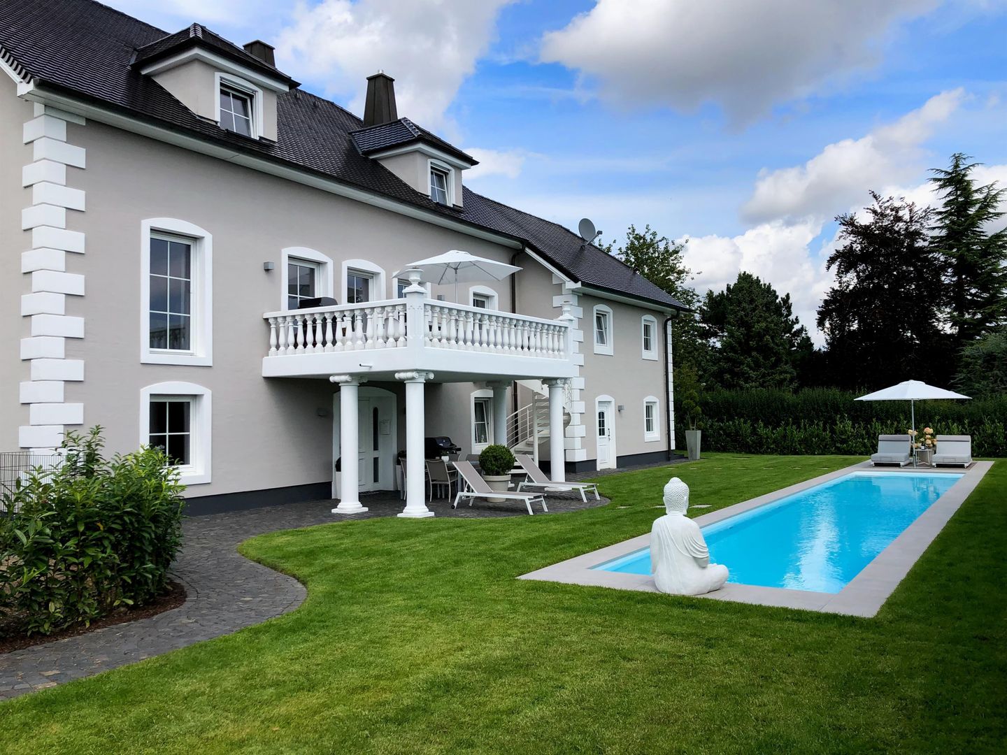 Die 90 Quadratmeter große Wohnung mit eigenem, barrierefreien Zugang und Parkplatz bietet Platz für bis zu 4 Personen (2 Schlafzimmer). Ihre Terrasse befindet sich direkt am Pool und verfügt über eine Sitzgruppe, Sonnenliegen und einen Gasgrill. An kühleren Tagen lädt die Sauna (zur Alleinnutzung) mit Ruheraum zum Entspannen ein.