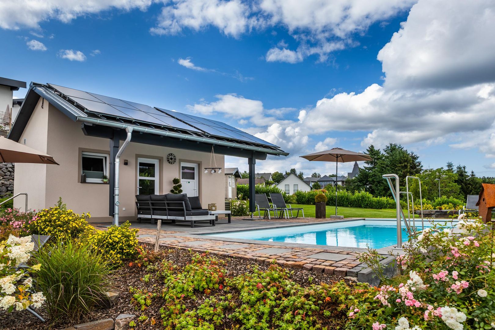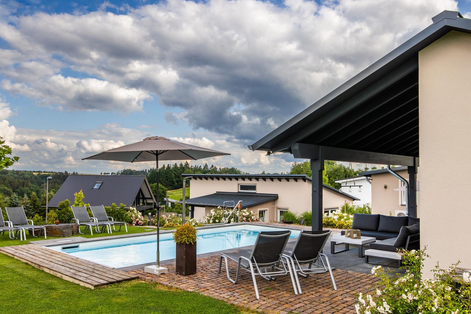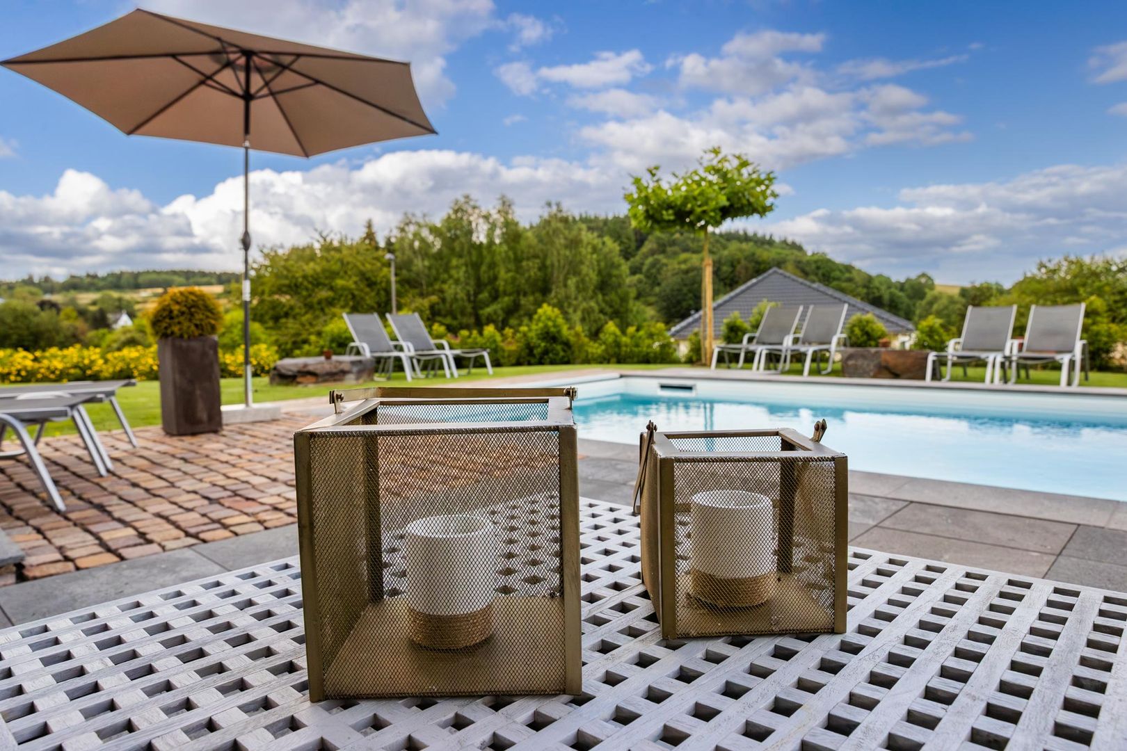 In der warmen Jahreszeit lädt die eigene Terrasse zum gemütlichen Beisammensein ein und der große Pool bietet eine angenehme Erfrischung. An kälteren Tagen oder nach aufregenden Ausflügen könnt ihr euch jederzeit in der Sauna aufwärmen und entspannen.