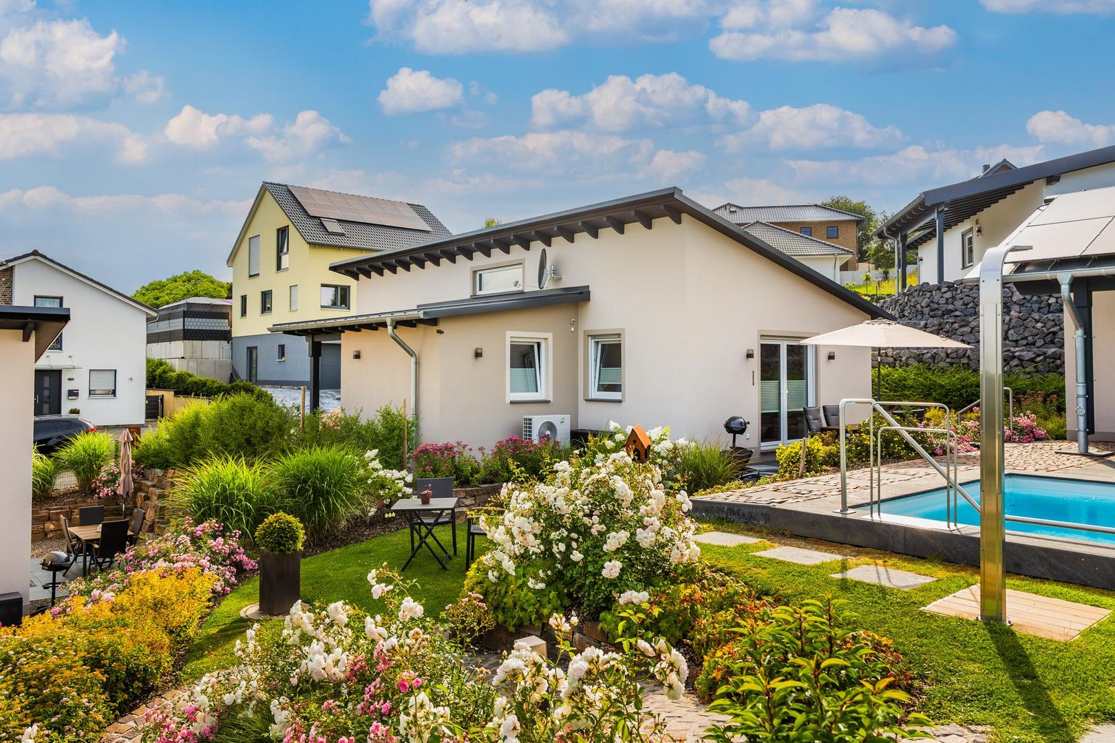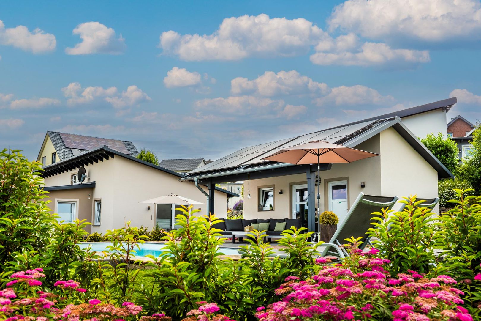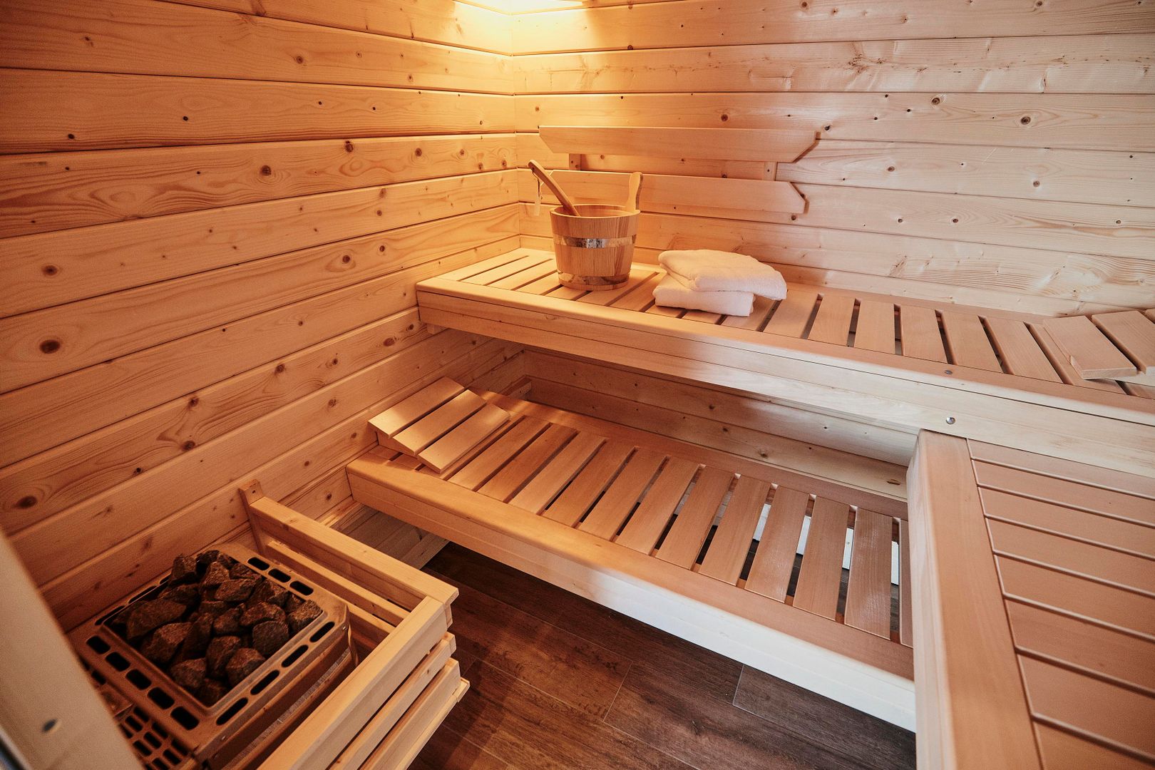 In der warmen Jahreszeit lädt die eigene Terrasse zum gemütlichen Beisammensein ein und der große Pool bietet eine angenehme Erfrischung. An kälteren Tagen oder nach aufregenden Ausflügen könnt ihr euch jederzeit in der Sauna aufwärmen und entspannen.