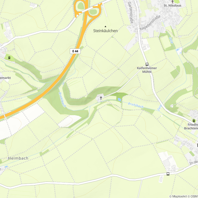 unweit der Orte Kaifenheim, Brachtendorf und Zettingen in der Vordereifel. Die umliegenden Felder, Wiesen und Wald gehören zum Hof.