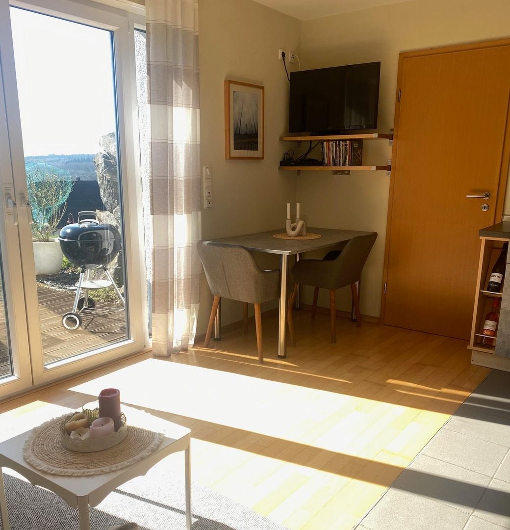 Mit traumhaftem Blick auf umliegende Wiesen, den Bach, der sie durchfließt, und den angrenzenden Wald, bietet diese neue, großzügig angelegte und modern eingerichtete Ferienwohnung Erholung pur inmitten von Natur.Die Ferienunterkunft befindet sich auf einem ehemals landwirtschaftlich genutzten Hof im ruhigen Tal des Brohlbachesunweit der Orte Kaifenheim, Brachtendorf und Zettingen in der Vordereifel. Die umliegenden Felder, Wiesen und Wald gehören zum Hof. Ihre „Oase der Ruhe" ist trotz der Alleinlage verkehrstechnisch sehr gut angebunden (u.a. Autobahnanschluss A 48 Kaifenheim) und bietet so auch eine Möglichkeit zu vielfältigen Aktivitäten und Unternehmungen. Über einen asphaltierten Feldweg, der nur landwirtschaftlichen Fahrzeugen und den Besuchern des Hofes offensteht, erreichen Sie in 1-2 km Entfernung die Landstraße und Autobahn, über die Sie die zahlreichen Sehenswürdigkeiten und Ausflugsziele der näheren und weiteren Umgebung erreichen: Burg Eltz und Burg Pyrmont Schloss Bürresheim Kloster Martental die Stadt Mayen u.a. mit Genovevaburg und Schieferbergwerkmuseum Laacher See mit Kloster Maria Laach die zahlreichen vom Vulkanismus geprägten Maare das römische Trier, die älteste Stadt Deutschlands Koblenz mit dem Deutschen Eck am Zusammenfluss von Rhein und Mosel Sie können Ihre Ferienunterkunft aber auch zum Ausgangspunkt machen für eine morgendliche Laufrunde durch taufrische Wiesen kürzere und ausgedehnte Spaziergänge/Wanderungen auf den zahlreichen Wanderwegen in direkter Umgebung oder auf den in wenigen Kilometern erreichbaren "Traumpfaden" und „Traumpfädchen".