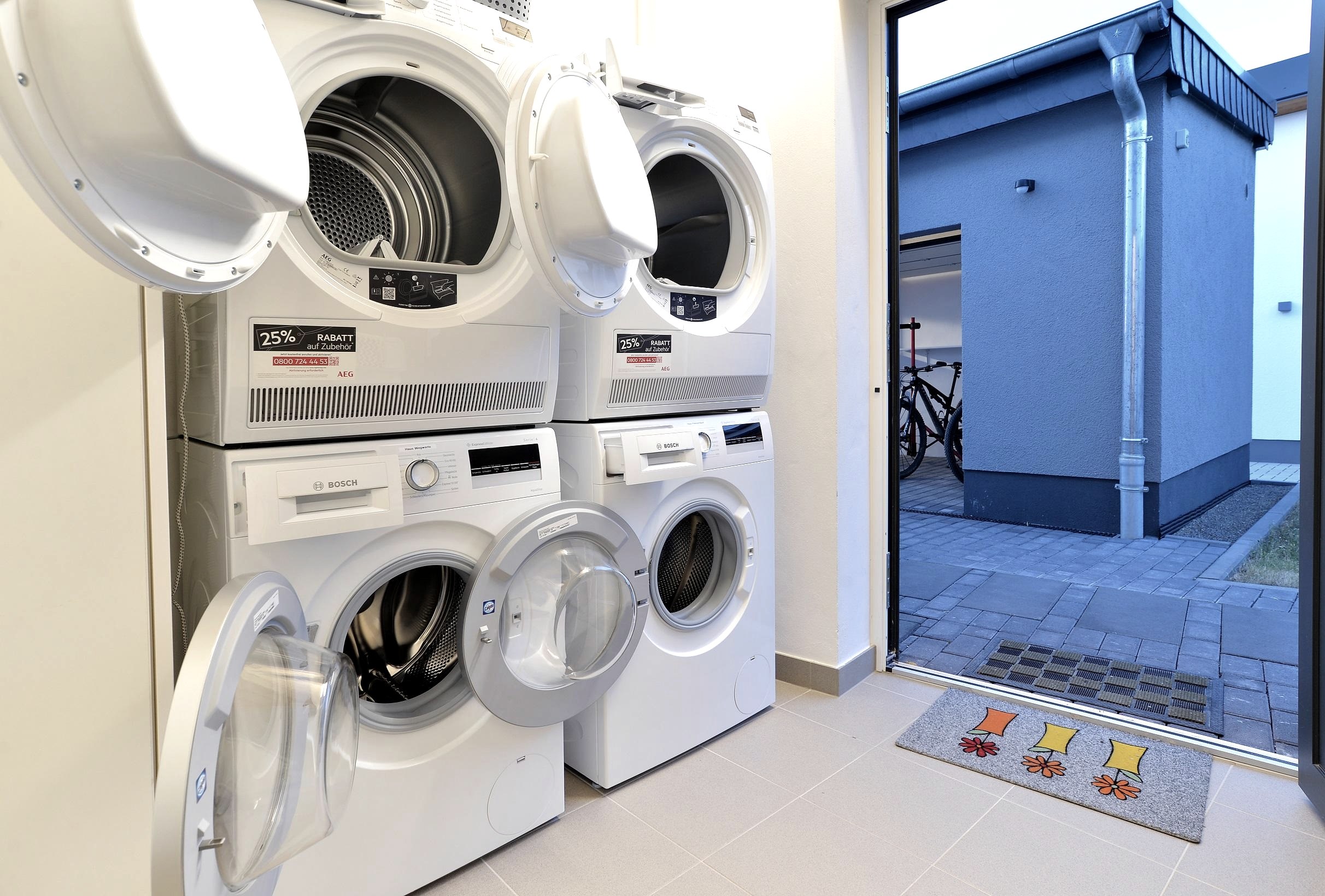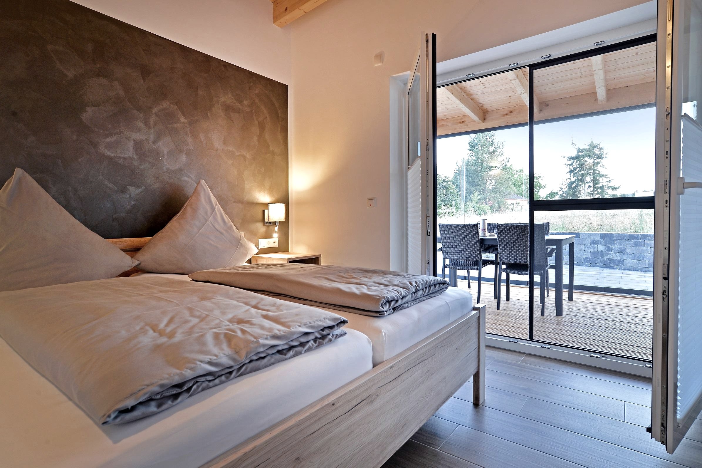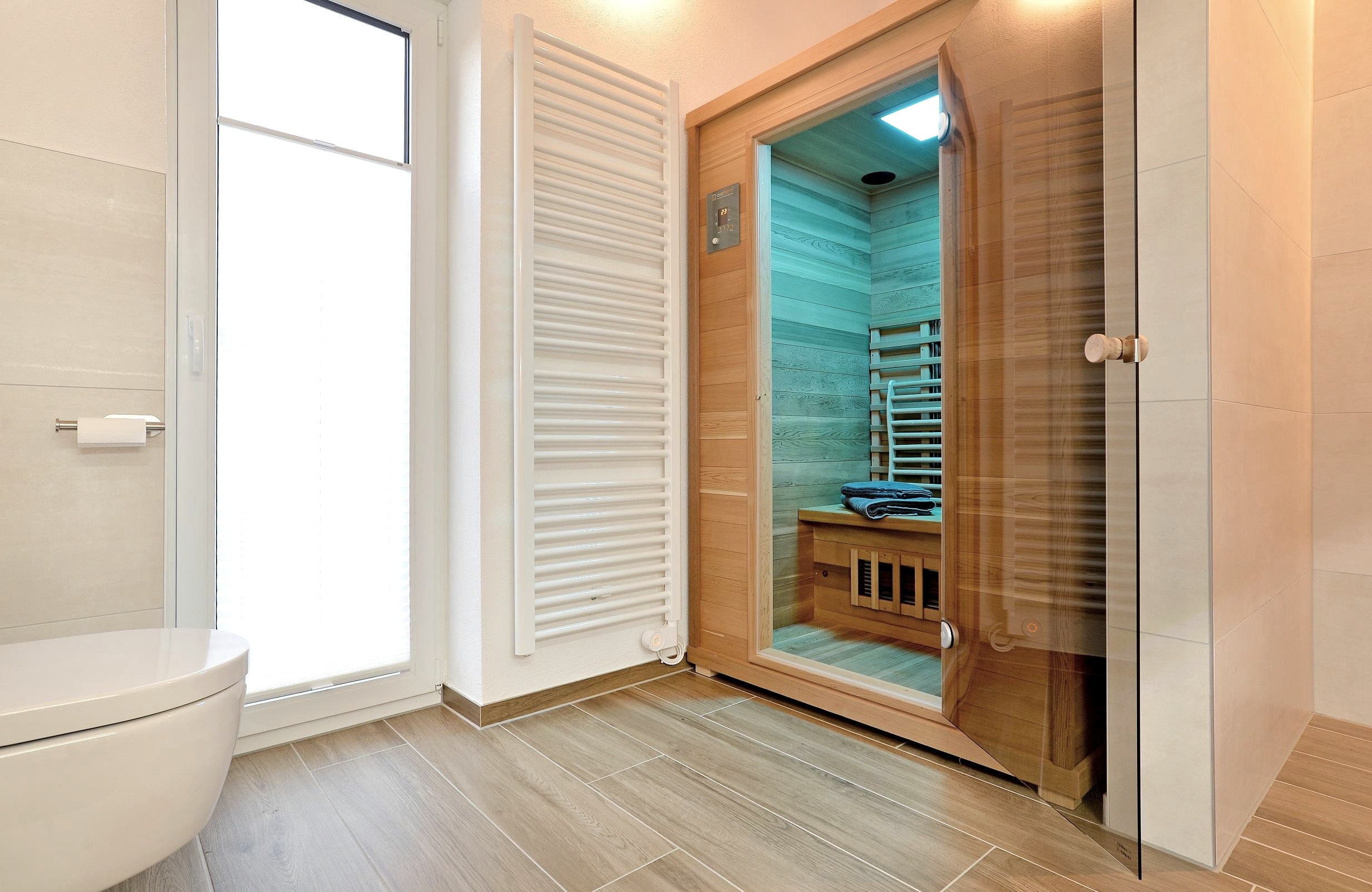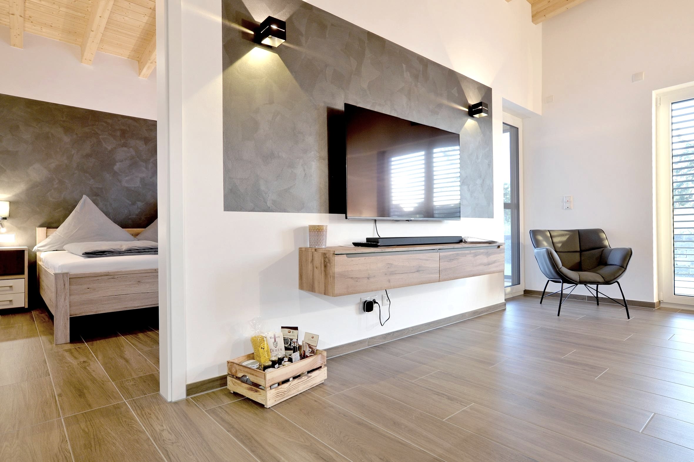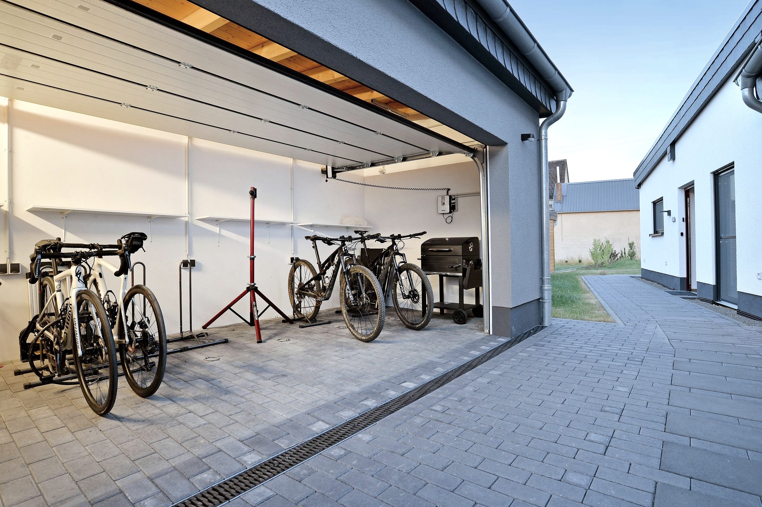 Unsere Ferienhäuser verfügen jeweils über ein Doppelzimmer, ein Einzelzimmer, einem großzügigen Bad mit Infrarotkabine und einem offenen Wohnraum mit Küche. Die großzügige Terrasse hat einen direkten Zugang vom Wohnraum, aber auch vom Schlafzimmer aus. Die Terrasse ist bei Bedarf von drei Seiten wind- und regengeschützt und kann so auch an kühlen Herbsttagen genutzt werden. An warmen Tagen könnt ihr die mobile Glaswand öffnen. Die Fenster sind mit einem Fliegenschutz versehen. Im gemeinsam zu nutzenden Hauswirtschaftsraum stehen für jedes Ferienhaus je eine Waschmaschine und je ein Trockner kostenlos zur Verfügung. In der abschließbaren Fahrradgarage stehen eure Räder sicher. Es befinden sich dort sechs Steckdosen für die Ladegeräte eurer Pedelecs und ausreichend Ablageflächen. Eure Räder könnt ihr dort bei Bedarf anketten.