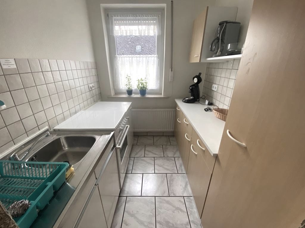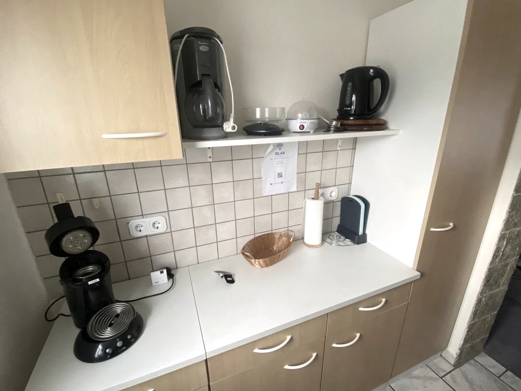 • kleine Küche mit Kühlschrank, Herd und Backofen