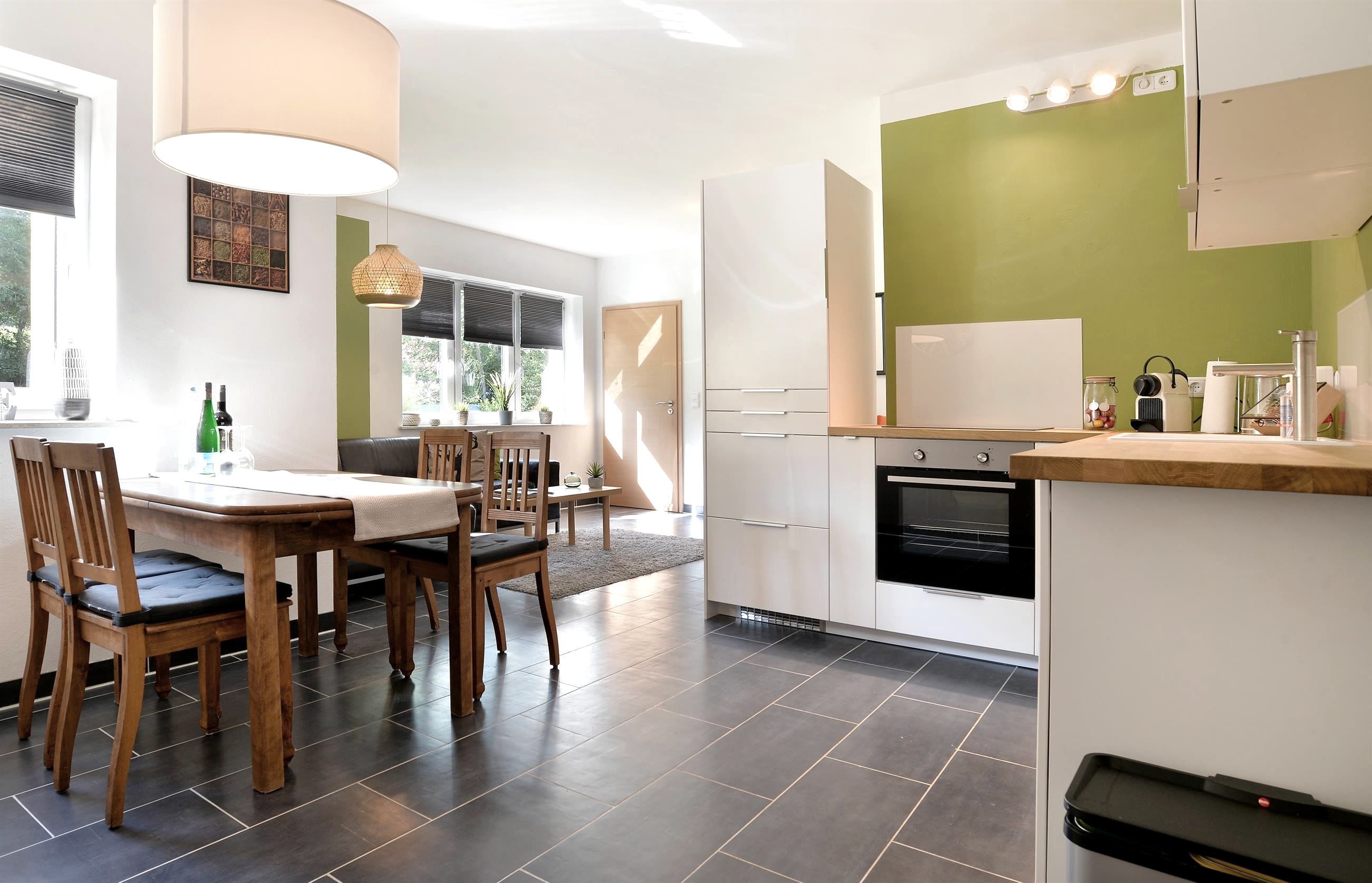 Es handelt sich um eine Einliegerwohnung mit privatem Eingang und Parkplatz direkt vor der Unterkunft.Die Wohnung besticht mit einem offenen Wohn- und Essbereich, einem Schlafzimmer und einem Bad. Der Wohnraum bietet alles, was man für einen unbeschwerten Urlaub braucht. Ein offener Wohn- und Essbereich. Dieser hat ein großes Sofa, TV und einen Essbereich. Eine Küche die mit Ceranfeld, Backofen, Kühl-Gefrierkombi, Nespresso-Maschine, Wasserkocher und Spülmaschine ausgestattet ist. Im Schlafzimmer befindet sich ein großes, gemütliches Doppelbett (190x200) und im Bad ist eine Dusche mit Doppelwaschtisch und WC.