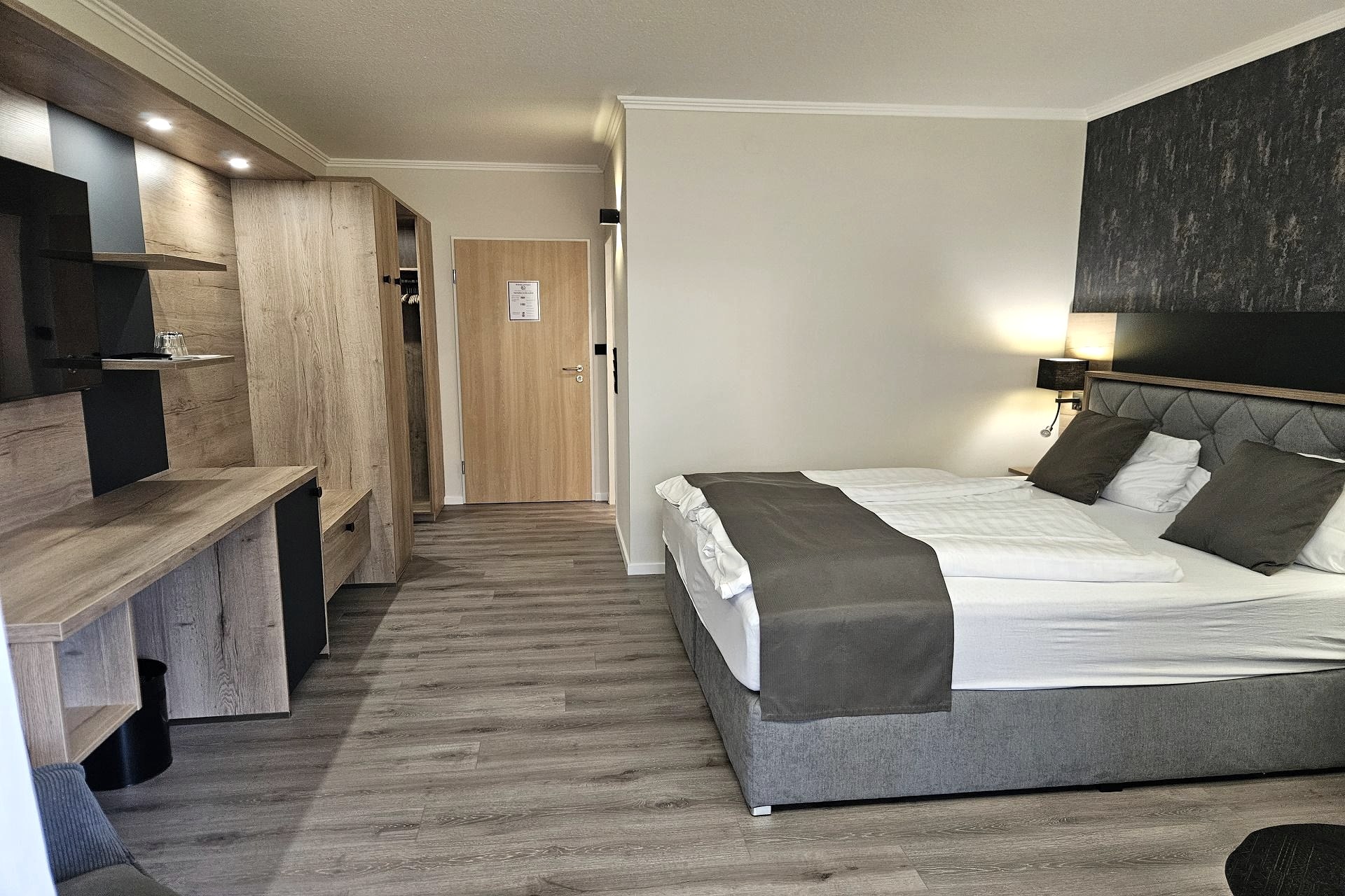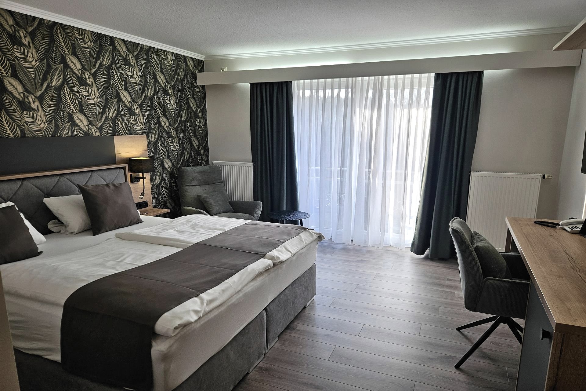 Komfortable und in warmen Tönen eingerichtete Zimmer mit Balkon/Terrasse, ein Lift, ein Wasserbett und in vielen kleinen Annehmlichkeiten eines guten 3-Sterne-Hauses erwarten Sie.